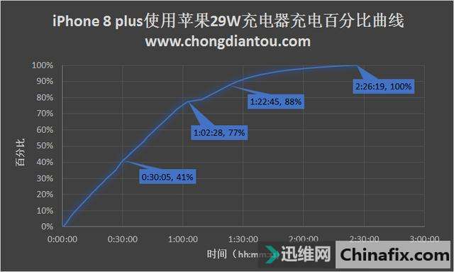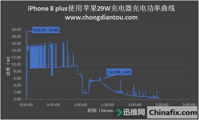 | 自iPhone8/8 Plus发布以来,热度不减。而相比以往来说,今年普遍更加关心手机充电这个话题。搭载的USB PD充电技术会让用户的运用体验提升了不少。此前,充电头网已经在第一时间对iPhone 8 Plus 的兼容性能做了相关测验。测验结果也比较令人满意,相信很多小伙伴都在为不必再花昂贵的费用购买官方充电器而暗自窃喜。但是,对于官方宣称“30分钟最多可充至50%电量”的说法,你又了解多少呢? “可快速充电”到底有多快?运用USB PD充电器给iPhone 8/8 Plus充电,多久才能充满?大功率充电,手机会不会发热很厉害?带着这些疑问,我们对iPhone 8 Plus进行了一次0~100%电量的充电测验。 测验环境温度约为28℃,运用苹果官方29W充电器, 苹果官方双头Type-C线以及Type-C to lightning线;整个测验过程的数据运用POWER-Z KM001全程监测。另外,手机的充电温度通过FLIR测温仪获得。下图为POWER-Z KM001记录的整个充电过程中的电压、电流变化曲线。黄色表示电压,青色表示电流。 虽然此前的是兼容性测验表明,iPhone 8 Plus支持15W快充技术,并且能够支持29W充电器14.5V输出。但是从此次测验的曲线图中可以看到,iPhone 8plus 在运用官方29 W充电器充电时,并是不全程恒高压,14.5V高压输入只能连续70min左右,充电后期会自动降压到5V输入直至手机电量饱和。 另外,小编也将整个测验过程中抓取的数据整理成了一份功率曲线。如下图: 通过这条曲线,可以很清晰的看出手机在充电过程中的功率变化情况。同时也可以获得两个信息: 1、峰值功率。此次测验中抓取到了一个高达19.5W的峰值功率,但是出现的频率极低,稳定的功率普遍在15W上下。之前一直有很多小伙伴在问,为什么有的手机能够测出近20W的功率?现在可以给出答案了,基本靠碰运气! 当然,手机个体之间存在的细微不一样也是一方面的原因。 2、恒压充电时间。功率曲线显示,在1小时22分钟以后,手机开始进入恒压充电阶段。此后,充电电流会慢慢减小,整个过程约耗费1个小时。 这是一条关于手机电量百分比的变化曲线。截取几个关键的点: 1、充电30min电量可到41%。由于受测验环境和测验工具的不一样,此次测验未能达到官方宣称的最大值。 2、充电1小时,电量可达75%以上。这个充电速度应该算是iPhone手机充电史上的里程碑了。当然,这也是大部分人期待的。要知道,iPhone 7 plus运用原装充电器充电1小时,才能达到30%的电量。 3、后期充电时间偏长。虽说相比前辈们而言,iPhone 8 plus充电速度提升不少,但充满最后10%的电量却要耗费近1个小时时间,导致整个充电过程耗费了约2小时30分钟。所以,这可能会引来一大波吐槽,尤其是对于那些不把手机充满誓不断电的强迫症患者。 手机的充电温度应该也一直是大家比较关心的问题。不过好在,iPhone 8 plus在此次充电过程中的温度还比较令人满意。室温28℃的情况下充电45min,温度约为46℃。而充电60min后,温度已经降到了41℃左右,稍高于人体体温,拿起手机时,几乎感觉不到发热。 最后来划一下重点。iPhone 8 plus运用官方29W充电器充电,完全充满手机需要耗费约2.5小时。当手机电量低于75%时,支持USB PD快充技术,快充技术功率维持在15W左右;前期充电速度很快,1小时可充至75%以上。在支持大功率充电的同时,手机的发热控制良好,用户不必为充电温度而担忧。 |