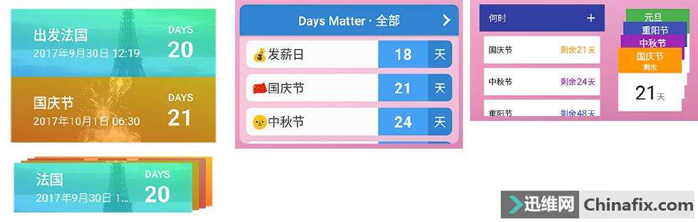 | 不管是生活还是工作,总有一些让你特别关心或期待的日子,还有 25 天就可以发工资了,再过 16 天小宝就一周岁啦。对于这些日期总会不自觉的在心里计算剩余的天数,然而日期数量一多,大脑就顶不住了,此时需要用 App 来协助。 作为一个在 苹果iOS 上用惯了 Days Matter(中文名:「倒数日」,为避免和文中倒数日这一类 App 统称混淆,本文所有以英文名称呼)的用户,转投 Android 后为了尽可能减少数据迁移成本,自然首选官方 Android 版。很可惜,官方 Android 和 苹果iOS 版之间数据无法迁移。 既然都要从零开始新建倒数日,干脆尝试下同类 App。多方筛选后最终预选 Google Play 上面评分较高的「何时」与「Hurry」,同 Days Metter 做个对比。 比 App 本体更重要的 Widget 如果一个日子需要计算倒数天数,那它肯定足够重要,要能很方便的查看剩余天数。鉴于 Android 的开放性,用桌面小插件 Widget 显示倒数日期自然是最佳方案。那些不支持 Widget 的倒数日 App 根本无法愉快地运用,直接无视。 对于 Widget,Days Matter、「何时」与 Hurry 都提供「单事件」和「多事件」两种显示方式。 单事件显示 以 App 所能提供的最小占屏规格 Widget 为例: 1. Hurry 最小 Widget 占屏尺寸 2 × 1,其透明背景效果颜值最高(可选黑色文字),并且 Widget 可以根据大小尺寸自动调整显示效果; 2. Days Matter 虽然占屏尺寸最小 1 × 1,但实际和 App 图标融入效果并不好,高度上无法对齐,真是逼死强迫症; 3. 「何时」 Widget 背景色可在 App 内设置,当出现多个单事件 Widget 时易于区分,但是它占屏尺寸 2 × 2,即横竖方向都占两个 App 空间,而 Widget 实际显示内容其实仅需要 1 × 1 的空间,放入一堆 App 中有种「都给我让开!」的感觉。 可以看到,Hurry 的单事件 Widget 显示效果远好于另外两者,百搭各类壁纸,颜值 π 必备。 多事件显示 Hurry 提供「列表」和「堆栈」两种显示模式,堆栈支持前后手动翻页。大色块显示效果感觉与 WP 系统更配,在 Android 系统上有些不协调,当然人各有所好; Days Matter 仅提供列表模式,点击 Widget 右上角「>」可以按标签切换分类显示;「何时」同样提供列表和堆栈两种显示模式,通过列表右上角「+」可以快速添加新事件,而堆栈除了可以手动翻页还支持自动循环翻页。 三者多事件 Widget 显示效果区别不大,不过 Days Matter 分类查看功能比何时快速新建事件更实用。因为每个人一年中需要倒数的日子无非各大节日、亲朋好友生日,一般新建功能不会常用。 App 主界面 三者主界面中,Hurry 最文艺,动态的秒数倒计时配合背景动态图片赏心悦目,往左滑动显示已过期的事件。Days Matter 置顶事件会放大显示,从屏幕左边缘往右划会显示侧边抽屉,可以按标签分类查看事件。往左滑动切换「历史上的今天」和「日期计算器」功能。「何时」与 Days Matter 主界面区别不大,左右滑动切换「全事件」、「本周内事件」和「本月内事件」,置顶事件融入顶部 Tab 标签中,个人感觉看着更舒服。Hurry 与「何时」的新建按钮在主界面右下角,标准的 Material Design 风格,方便大屏幕操作。Days Matter 完全沿用 苹果iOS 版规划,在普遍大屏幕的 Android 设备上体验并不友好,人家 苹果iOS 有双触 Home 键显示区域下移功能。 对于倒数日类 App,主界面是 Widget 的后台为其服务,所需功能无非新建、删除、调整事件而已,多余的功能都显得累赘。何时在这方面做的最好,该有的都有,不该有的没有。 新建事件参数 新建倒数事件时日期自然是最重要的参数,除此之外还要考虑日期输入的便捷性、本地化以及备份等功能,下图是功能矩阵图。 阴历(农历) 阴历一般用于中国传统节日,Days Matter 与「何时」由国人开发自然支持此功能。实际生活中更习惯运用阳历(公历),比如设置了中秋节农历八月十五倒数日,我想知道那天具体是星期几,和国庆节相差几天。 从下图显而易见,「何时」的日期选择界面就很人性化,同时显示阴阳历不用单独翻看日历确认,点击左下角「阳历」可切换为「阴历」日期输入。而 Days Metter 就显得不够便捷,没有考虑到用户的实际需要。 备份与还原 这年头换个手机真是家常便饭,但是每次更换时数据迁移让人头疼,备份与还原就显得很有必要。 不幸的是,Hurry 不支持任何形式的备份还原,像我有十几条倒数日数据,更换手机后重新输入数据相当不便。 Days Matter 支持本地备份,嗯,仅支持备份无法还原,估计是个Bug。虽然 App 提示找到压缩包后点击即可还原,实际根本无效。另外 苹果iOS 和 Android 的备份数据格式不一样(分别是 .idmbak 和 .dmabak 文件),因为无法还原,暂不确定两个平台数据是否通用。 「何时」也仅支持本地备份还原,虽然与 Days Matter 同为本地操作,「何时」可以直接在 App 内还原,无需在文档中找备份文件,而且支持自动备份。不过「何时」仅能保留最后一次备份数据,Days Matter 可以备份多个数据。 本地备份也只能算聊胜于无,手机被盗或无法开机时只能抓瞎,如果支持备份到服务器就完美了。 其它功能 精确到时间:虽然 Hurry 与「何时」都支持精确到时间,不过 Hurry 对于时间输入是强制性的。事件置顶:在所有的倒数日中,肯定有一个最重要的,那么就把它置顶吧。Hurry 只能按日期先后顺序排列事件。周期循环:Hurry 只能在「日期 & 时间」输入完成后选择循环周期,无法在事件建立后单独设置。对于已经建立的事件,只能重新编辑「日