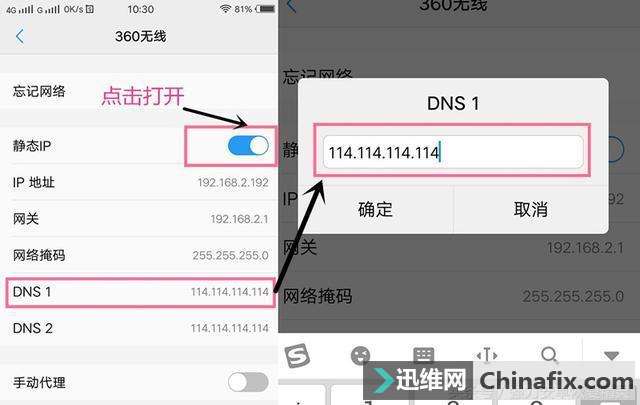 | 你是不是也有过这样的经历,到超市,到咖啡厅,到朋友家里玩连上wifi之后,朋友的网速很快,自己却连网页都打不开,难道是因为这wifi还认生,陌生人连上去速度慢?当然不是啦,只是你的wifi设置不正确,想要连上wifi之后有更快的速度,可以修改DNS。 如果说DNF可能很多人知道,DNS知道的人可能就不多了,那么什么是DNS呢,简单来说DNS是域名系统 (Domain Name System) 的缩写,它是由解析器和域名服务器组成的。域名服务器是指保存有该网络中所有主机的域名和对应IP地址,并具有将域名转换为IP地址功能的服务器。 接下来我实际演示一遍如何设置DNS来提升手机连接wifi之后的网速,大家要好好看好好学哦。 首先打开手机设置,找到WLAN选项,点击进入下一界面: 然后我们看到下图界面,我们把静态IP开关打开,然后找到DNS点击一下,点击我们所连接上的WIFI后面的更多图标,然后我们把DNS修改成114.114.114.114。点击确定就完成了。 除了设置DNS我们也可以通过在WLAN——WLAN+,智能选择WLAN,开启,智能选择最佳网络连接,让手机自动选择速度最好的网络进行连接。 通过上面这些方式和设置,就可以大大提升我们手机连接上wifi之后的网络速度了,是不是又简单又实用,赶快去试试吧。 |