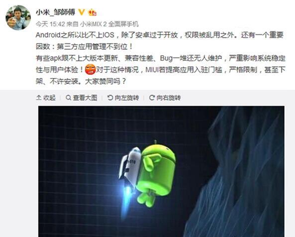| 对安卓手机好还是苹果iPhone流畅,可能现在提出这个问题安卓粉和果粉还是会各执一词吧?其实现在安卓系统的流畅度和IOS真的没有什么分别了。但小智换个问法,安卓软件和IOS软件,哪个更好用啊?这个肯定大家都会一致认同IOS的APP比较好用,没有悬念。 为什么?因为苹果对IOS的第三方APP有明确的制定标准,因为APP都必须要遵守这个标准才可以上架苹果官方商店。这些标准小智随便说几个安卓的第三方APP就无法做到:比如要有统一的UI和操作逻辑,不允许过多的申请占用系统内存,不允许不一样APP之间的相互唤醒,不允许未经用户同意访问其个人隐私和资料和调用系统API接口,不允许私自向用户推送广告。 除此之外,IOS的第三方APP还必须要做到极佳的兼容性,必须所有辨别率的苹果设备通吃,要规划上还要考虑老款配置较差的机型,尽量做到无论是旧款还是新款iPhone,都能有一样的平滑流畅体验度。 小编一句话总结安卓系统和苹果IOS系统的软件环境差距,安卓系统现在是管好了自己,却管不住别人。而苹果IOS是既能管住自己,也能管住别人。所以最后的结果就是,IOS系统运用久了确实要比安卓系统要流畅。但也要强调这本身并不是安卓系统不好,而是开放系统的环境导致。毕竟苹果IOS是闭源系统。 那么,如果安卓手机也既管好自己也管好别人呢?不是就能达到和IOS系统一样流畅的效果了吗?而现在,可能小米真要这么做了!小米公司旗下工程师@小米_邹師傅表示,安卓之所以比不上苹果iOS,除了过于开放,权限被乱用之外。还有一个重要原因:第三方使用管理不到位!有些APK跟不上大版本更新、兼容性差、Bug一堆还无人维护,严重影响系统稳定性与用户体验! 对于这种情况,如果小米MIUI提升使用入驻门槛,严格限制,甚至下架、不许安装。 也就是说以后质量差,兼容性差,权限乱申请的烂APP,可能小米MIUI将直接不支持安装。用这个简单粗暴的方式来最大程度的提升手机的流畅度! 小编个人觉得这有点太极端了,但以现在国内的安卓APP来看,还真的只有这样才能获得最好的体验。可是这也是伤敌一千自损八百的办法,大家真的赞同吗? |