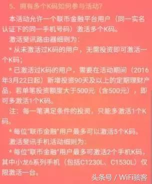 | 看到图片也许有的小伙伴知道,这是斐讯k2的路由器,免费领的。今天把这个介绍给大家,然后解密一下斐讯免费送你路由器的真正原因! 1、领取方式 大家领取K2路由器的方式可能各不相同,今天介绍一下我是怎么领取的。首先我在京东商城运用白条下单,买的是最贵的那种,原来想的是反正送的,如果不返钱,就退回去,后来看一下返现是一个月,白条正好也是一个月免利息,于是就留下来自己用了,一个月后确实返了现。(后边给大家揭秘) 现在正好是京东搞年货节,路由器储备多一些,建议大家早些下单,不然以后要预约啦,我领的时候等了4天才拿到。 2、路由器的优点 路由器毕竟是免费领取,首先说一下它的优点:路由器是双频的,支持最新5G wifi信号,这点很好,现在生活中运用5G信号的路由器不是很多,可以避免信号干扰,运用时也可以自己选择2.4G还是5G,同时运用双频也可;其次是功率强劲,像官方说的一样,功率大些,加上四天线穿墙还是很容易的;再次是可以做中继运用,双频率可以搜索到附近所有无线WiFi信号,pojie完无线WiFi再中继过来,爽!;支持APP功能,可以在手机上用app管理路由器,对一些不会设置的亲是一种很好的工具... 3、返现方式 说道返现,不得不揭秘一下斐讯的盈利模式:路由器是上网的入口,斐讯就是在这里做文章,免费送你路由器,暗地里却组建自己的商业王国。第一:返现并不是直接给你返到你的银行卡,而是以金融理财产品返给你!买回路由器后下载它的理财APP扫描k码,然后就给你一个月399元的金融产品,到期后399你才能取到银行卡。如下图: 理财产品到期后提取到认证的银行卡中。这就是斐讯的o2o金融战略,即推广了路由器又推出了自己的金融理财产品,一举双得!这里我不建议大家运用金融理财产品,理由是你懂得。 斐讯路由器支持一个人最多领取5个路由器,除第一个路由器外,其他要购买500元的三个月理财产品,才能扫描 第二个k码,如图: 4、暗藏购物推荐 路由器中暗藏了购物推荐功能,懂淘宝客的朋友们一看就会明白。官方说:开启购物比价功能后,当您在浏览购物网站的商品购买页面时,路由器将为您同步加载其他商家该商品的价格信息,让您待购买商品的价格一目了然,实际上是它自己挣了推广费用,如果你是一个网购狂,一年下来斐讯拿你的推广费就很多了。这个功能做的很隐蔽,还好斐讯提供了关闭按钮,大家运用时可以选择关闭。 斐讯现在也在做自己的生态,商城、自媒体、社区等等,在上网的入口摆摊,这也算一个很可观的未来商业模式吧。 其他的安全问题小编没有专业测验,不是很清楚,如果有小伙伴们知道,可以告诉我们~分享是一种愉快,你说呢? |