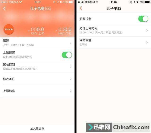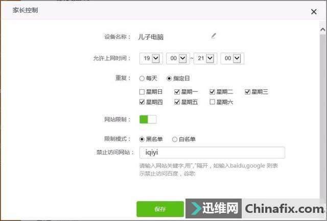 | 近日举行的2017国家网络安全宣传周高端智库论坛发布,“千禧一代”青少年(12岁-19岁)的互联网普及率高达92.7%,玩游戏、听音乐、聊天及查资料学习是其上网时的主要活动,其中玩游戏占了最大比重。 不论是防沉迷系统还是非理性消费退款,都难以从根源上搞定问题。孩子认知力和自控力都有限,家长的监管教育才是防止孩子沉迷游戏的最有效办法。 国庆长假将至,孩子更是禁不住游戏的诱惑想要大展身手,家长们不用时刻紧盯,也不提倡禁止孩子运用手机和电脑,限制孩子假期上网时间和上网行为只需要收到其他维修同行的一台防“沉迷”小助手——腾达AC10就可轻松搞定。 那么AC10如何防沉迷?你只需要 .... 开启AC10的家长控制模式▼ 它可以管理孩子访问网络的时长、访问的内容等等,还能有效对孩子的上网行为进行管控。 01在PC端设置 在浏览器地址栏中输入:http://tendawifi.com或默认登录地址192.168.0.1,输入路由器管理界面登录密码,点击“高级功能”后选择“家长控制”,对需要控制的设备设置允许上网时间和禁止/允许访问的网站等。 在设备列表中找到孩子的手机/电脑/平板,点击“家长控制”,在“允许上网时间”选择19:00~21:00,然后选择“指定日”周一至周五,在禁止访问网站栏里输入网站关键词,如“iqiyi”,这样孩子就打不开爱奇艺了。 02运用Tenda 无线WiFi手机APP设置 腾达AC10支持通过手机APP来进行家长控制的设置,方式与PC端的设置方式一样。在Tenda 无线WiFi APP里,家长可以实时监测到孩子运用网络时间和网速。另外,APP还支持设备上线提醒,当孩子的设备连接路由器时,系统会自动发送通知到家长的手机里,不仅如此,APP还支持远程管理,即使出门在外也可以随心掌控孩子的上网情况。 腾达AC10不仅是孩子上网防“沉迷”小助手,它还是普通光纤家庭用户追求高质量无线WiFi的必备路由。 腾达全新千兆无线路由器AC10,采用全新一代11ACWave2.0技术,外置4根6dBi高增益天线,双频并发速率高达1167Mbps,支持MU-MIMO技术,能够同时向多个终端设备传输数据,以满足多用户接入的需要,为用户提供高速流畅的无线WiFi体验,全面的上网行为管理和简单的安装设置体验。 |
