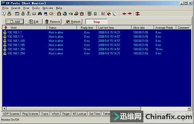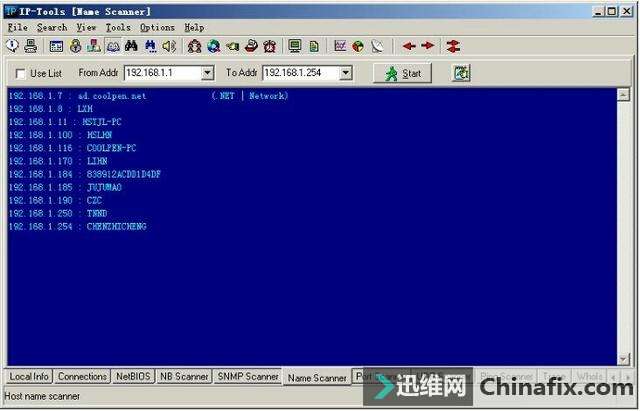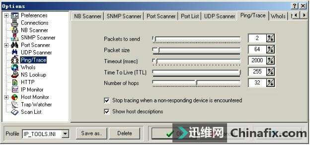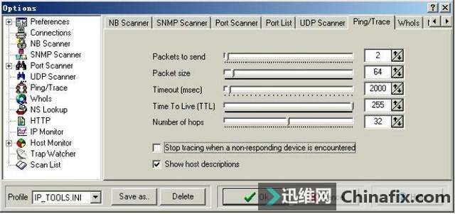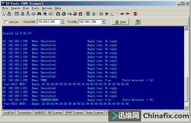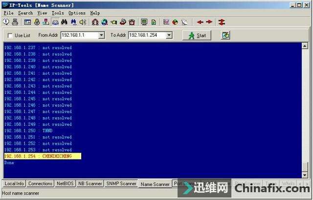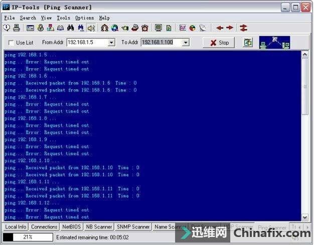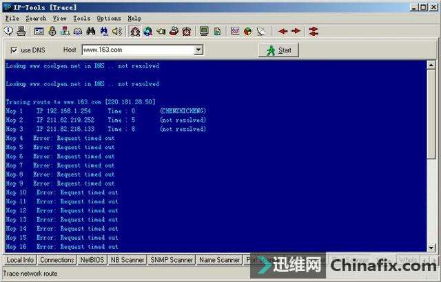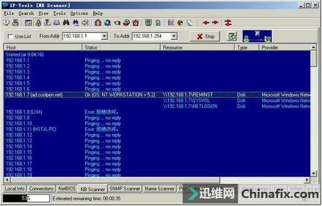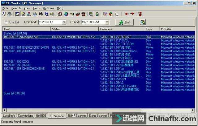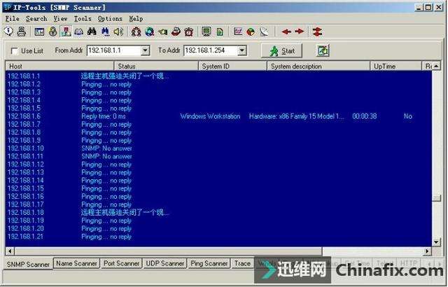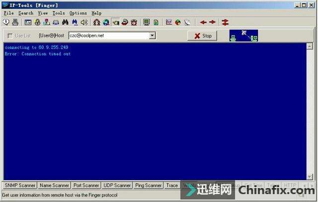 | 综合IP链路查询可以让管理员运用一种工具完成多种任务,例如ping、追踪路由和端口扫描等。现在运用比较多的综合IP链路查询工具有IP-Tools、WS_Ping ProPack和Netdiag等软件。 网管员的第三只眼睛——IP-Tools IP-Tools是一款功能非常强大的网络管理软件,该软件可以随时随地向管理员报告网络的运行情况。IP-Tools自身集成多种TCP/IP实用工具,如本地信息、连接信息、端口扫描、PING、TRACE、WHOIS、FINGER、NSLOOKUP、Telnet客户端、NETBIOS信息、IP监视器等。通过这些工具,管理员可以轻松掌握所管理的网络。 1.IP-Tools的安装与运行 IP-Tools的安装过程非常简单,具体安装步骤如下: 第1步,运行下载的安装文件,显示如图2-11所示的“IP-Tools Setup”对话框,在“Destination Path”框中,根据需要设置安装路径,这里保持默认。 图2-11 “IP-Tools Setup”对话框 第2步,单击“Install”按钮,即可开始安装,安装完成后显示如图2-12所示“Setup complete”对话框。选中“Run IP-Tools now”复选框,可以在完成安装后立即运行IP-Tools。 图2-12 “Setup complete”对话框 第3步,单击“Finish”按钮,IP-Tools开始检测系统和加载程序。完成以后,显示如图2-13所示的IP-Tools主窗口。默认情况下,该界面显示了本地计算机的各种基本信息,包括操作系统、处理器和内存信息。单击左侧列表中的项目,还可以查看Winsock数据信息、各种协议状态、网络信息及Modem等。 图2-13 IP-Tools主窗口 在“Local Info”窗口左侧的目录列表中,各选项的含义如下: OS, 处理器, Memory:默认显示该列表信息,包括操作系统版本,处理器和内存信息。 Winsock:包括本地主机名称、本地主机IP地址、Winsock版本和系统状况等。 Statistic:包括IP、TCP、UDP和ICMP的统计信息。 Route Table:本地计算机的路由表信息。 Network Interfaces:本地网络连接的详细信息,包括所支持的速度(bps)和MAC地址等。 Modems:如果本地计算机安装了Modem,此处会显示出Modem的详细信息。 All information:显示上述所有信息。 2.查看本地计算机的TCP/IP连接 在IP-Tools窗口下方选择“Connections”选项卡,可以查看本地计算机当前的TCP/IP网络运用情况,例如,系统中正在运用的端口,端口运用的协议、所连接的远程IP地址和远程端口,以及该端口所运行的进程和ID等,如图2-14所示。并且,该窗口中的信息每隔一段时间就会刷新一次。 图2-14 查看TCP/IP连接状况 在窗口中单击鼠标右键,并在快捷菜单中选择“Options”选项,显示如图2-15所示的“Options”对话框,可以根据需要设置显示方式及刷新速度。切换到“Connection Monitor”选项卡,在“Auto refresh every”文本框中,可以调整自动刷新的速度。若选中“Display host names”复选框,可显示每个IP地址的主机名,选中“Display port names”复选框可以显示每个端口名。在“Filter”选项区域中可设置是否要显示一些端口,如TCP、UDP等。设置完成后单击“OK”按钮保存即可。 图2-15 “Connection Monitor”选项卡 3.查看NetBIOS信息 在IP-Tools窗口下方选择“NetBIOS”选项卡,可以扫描网络中计算机的NetBIOS信息。在“From Addr”文本框中输入要扫描的IP地址,如果要查看本地计算机则只需输入“*”。单击“Start”按钮,随后会在当前窗口中列出所获得的支持NetBIOS的远程或本地计算机上的信息,这些信息包括MAC地址(即物理地址)、运用的最大会话数和最大会话包的大小等,如图2-16所示。 图2-16 NetBIOS信息 提示 在窗口中单击鼠标右键,选择快捷菜单中的“Clear”选项,即可将窗口中所显示的内容清空。 4.搜索网络共享资源 在IP-Tools的“NB Scanner”选项卡中可以了解到网络内的共享资源情况,操作步骤如下: 第1步,在“From Address”和“To Address”文本框中分别输入要扫描的起始IP地址和结束IP地址,单击“Start”按钮,IP-tools就会搜索该IP地址段,并列出每个IP地址所共享的文件,如图2-17所示。 图2-17 网络中的共享资源 第2步,扫描完成后,单击“Keep only found resources”按钮,会筛选扫描结果,只列出扫描到的主机和共享资源,如图2-18所示。 图2-18 可用共享资源列表 在扫描结果中,所显示的各选项的含义如下: Host(主机):所扫描到的IP地址和对应的计算机名。 Status(状态):响应结果。若为“OK”表示已成功扫描到其所对应的计算机,并已得到相应的共享资源;若为“Pinging…no reply(未响应Ping)”,表示其所对应的IP地址未被运用,或者此IP地址所在的计算机未连接到本网中或未开机;若为“List of resources is empty(资源列表为空)”,表示已成功扫描到该计算机,但未提供任何共享资源。若为“Error:由于尚未验证用户身份(用户身份验证错误)”,表示已成功扫描到该计算机,但因为权限不够,而不能共享其资源。 Resource(资源):计算机所对应的共享资源。 5.扫描网络中的简单网络管理协议(SNMP) 简单网络管理协议(SNMP)是用于管理IP网络管理网络节点(服务器、工作站、路由器和交换机等)的一种标准协议,是一种使用层协议。SNMP使网络管理员能够远程管理网络,发现并及时搞定网络问题。通过SNMP接收随机消息(及事件报告)网络管理系统获知网络出现问题。 选择“SNMP Scanner”选项卡,在“From Address”和“To Address”文本框中分别输入要扫描的起始IP地址和结束IP地址,单击“Start”按钮开始扫描段,显示如图2-19所示扫描结果。 图2-19 SNMP扫描 6.扫描网络中的计算机名 运用IP-Tools的计算机名扫描功能,可以得到所管理网络中各计算机的IP地址和计算机名等信