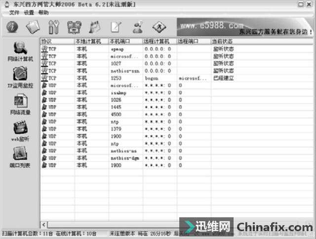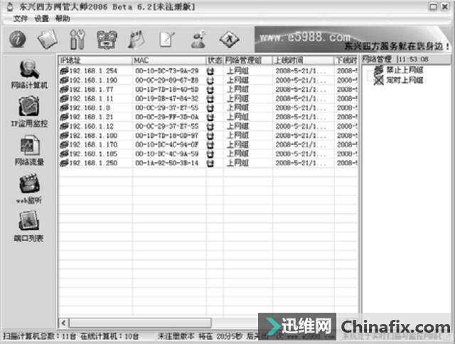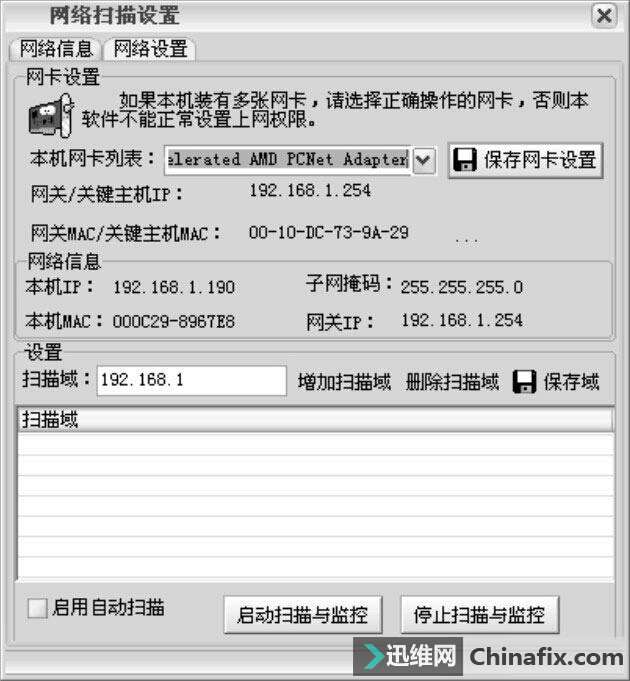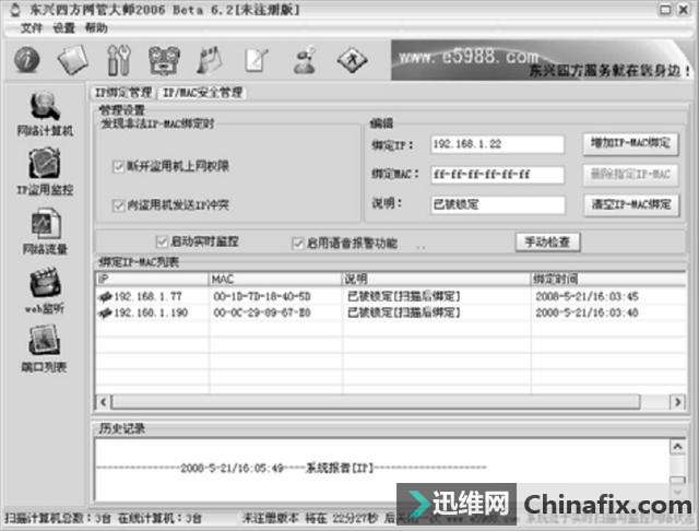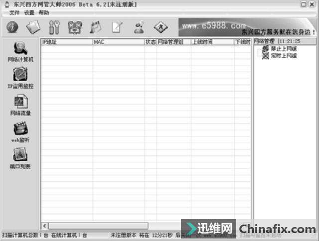 | 超级网管大师是一款专业的网络管理、网络监控软件,只需在局域网内的收到其他维修同行的一台普通计算机上运行,并且不需要安装客户端。该软件采用多线程规划,扫描速度快、操作简单、功能强大,是广大网络管理员的得力工具,适用于企业、学校、工厂、社区、网吧等网络管理。需要注意的是,安装前需先安装WINPCAP3.0以上。 ■ 安装及运行超级网管大师 SuperNetMaster的安装比较简单,保持默认设置即可。安装完成后,双击桌面上的软件启动图标,显示如图所示的“用户密码”对话框,在文本框中键入初始密码。 “用户密码”对话框 单击“OK”按钮,即可启动超级网管大师,如图所示。 超级网管大师主界面 ■ 设置并扫描网络 当第一次运行该软件时,需要设置扫描选项。 (1)在软件主窗口,单击“主机扫描段设置”按钮,显示如图所示的“网络扫描设置”对话框。在“本机网卡列表”下拉列表中,选择所运用的网卡。软件会自动识别网关、IP地址、MAC地址等信息。单击“保存网卡设置”按钮即可保存网卡设置。 “网络扫描设置”对话框 (2)在“扫描域”文本框中,键入IP网络段,例如192.168.1。 (3)单击“增加扫描域”按钮,将扫描域添加到扫描列表中。单击“保存域”按钮,保存设置即可。 (4)单击“启动扫描与监控”按钮,即可开始扫描指定域内的计算机。扫描完成后,关闭“网络扫描设置”对话框,在软件主界面中即可显示扫描结果,如图所示。 扫描结果 ■ IP盗用检查 IP盗用检查可以检查出私自修改IP的用户,但之前必须有历史记录,即以前执行过“保存当前扫描结果当作原始数据检查”功能。 在左侧控制列表中选择“IP盗用检查”选项,显示如图所示的界面。在“绑定IP”文本框中键入想要绑定的IP地址,在“绑定MAC”文本框中,键入对应的MAC地址。然后单击“增加IP-MAC绑定”按钮,即可将该绑定信息添加到“绑定IP-MAC列表”中。重复操作,可添加多个绑定信息。 IP盗用检查 添加完成后,单击“手动检查”按钮,即可开始检查,历史记录列表中显示检查结果。 从“检查记录”可以看到MAC地址前后的比较,由此来判定IP地址是否被盗用。 ■ 网络流量 可以查看当前网络中的数据包数流量。在左侧控制列表中选择“网络流量”选项,在右侧栏中即可显示当前网络流量情况,如图所示。 网络流量 ■ 端口列表 在左侧控制列表中选择“端口列表”选项,开始扫描端口设置,扫描完成以后,就会列出本机现在已经打开的端口,如图所示。 端口列表 从图中可以看到端口所运用的协议、对应的端口、远程计算机、远程端口、当前端口的状态等信息。 |