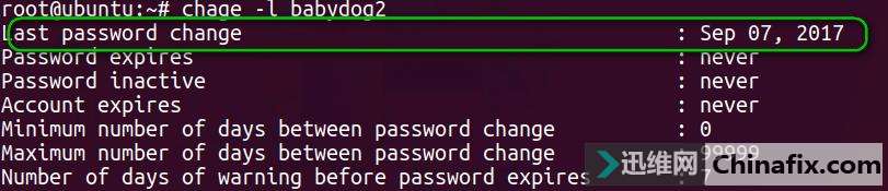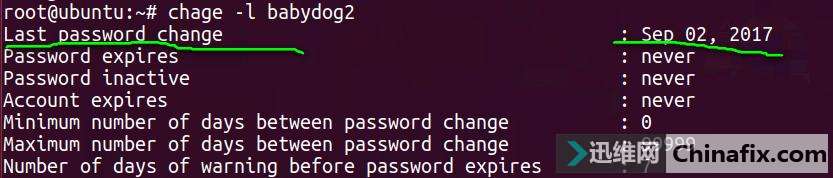 | 先祝各位国庆节愉快,玩的开心!o(*^@^*)o 还是通过一些例子来演示怎样运用 chage 命令修改和查看一个用户密码的信息,以及观察 /etc/shadow 文件中相应记录栏位的变化。注意 babydog2 用户记录的第3个字段,也就是上一次密码变更的日期是17411。首先,运用带有 -l 选项的 chage 命令列出 babydog2 用户密码的所有信息: chage -l 划线部分表示babydog2 最后一次修改密码的日期为 2017年9月2日,,接下来,运用带有 -d 选项的 chage 命令将 babydog2 最后一次修改密码的日期改为 2017年9月7日。这里 -d 是指 lastday ,日期的格式为:YYYY-MM-DD。 root@ubuntu:~# chage -d 2017-09-07 babydog2 系统不会有任何显示信息,因此运用带有 -l 选项的chage 命令再次列出 babydog2 用户密码的所有信息: 结果表明已经变更成功,随后可以运用 tail 命令列出 /etc/shadow 文件中最后 一行的记录以观察变化: root@ubuntu:~# tail -2 /etc/shadow babydog2:$6$DB8Q7an8$LGTZx9g/122XFE/iY2YL8iKH54EXvpVPSJ3LlwCpIc3YwJnVwV2CUjlAHr7HjtiAafyF4YqV4W9ZjysuPuO88.:17416:0:99999:7::: 显示结果第3个字段的值已经由 17411 变成了 17416 ,而从9月2日到9月7日正好需要增加5天。 今天就分享这么多了,谢谢欣赏!( _) |