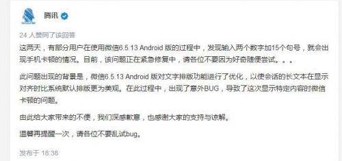 | 今天,我在这里给大家分享一个非常有趣的事情,就在昨天,我国的社交平台微信爆出了巨大漏洞,网民们纷纷整蛊自己的微信好友,下面让我们一起来看看是如何维修吧。 原来是有多位网友反馈,运用微信安卓版,如果发送“数字15+15个中文句号”,然而再进入聊天界面,会出现卡死的情况,微信提示崩溃,需要等待或关闭使用,而且发送信息和收到信息的安卓手机都会中招。 而得知这个消息的网友们也是耐不住寂寞,纷纷掏出自己的手机开始起了整蛊之路,顿时整个社交平台所有充斥着哀嚎声,咳咳.....其实我也是其中的一员,当时我刚打开微信,便看到心中的女神发了条微信给我,我用那戳破屏幕的力道打开了聊天框,结果刚看到一串句号就卡死,崩溃掉了,我还以为是意外,结果再次打开一直无响应,我顿时感受到了什么叫绝望。 哈哈,前面开个玩笑。其实从我刚才的玩笑话中就可以看出这个问题有多严重了,如果只是一个普通人,微信崩溃花一段时间清除记录就行了,但是如果是一个担负着重要职位或者特种职位的人遇到这样的问题就会造成很大的损失或者恶劣的社会影响,这点从上图中微信紧急声明中就可以看出了,在这里希望大家不要乱用漏洞,以免造成不必要的麻烦,给他人带来不必要的影响。 关于这个漏洞有网友发现是程序匹配排版发生的错误导致的,现在安卓手机无论什么品牌全都有一部分手机阵亡,阵亡的好像大多数是安卓6系统的手机,而IOS由于系统问题并没有出现这个漏洞。 截至发稿时,这个漏洞是否修复笔者尚未知晓,有知道的可以在下方评论。 你被微信好友整蛊了吗?或者整蛊好友了吗?他们什么表情呢?欢迎评论。 |