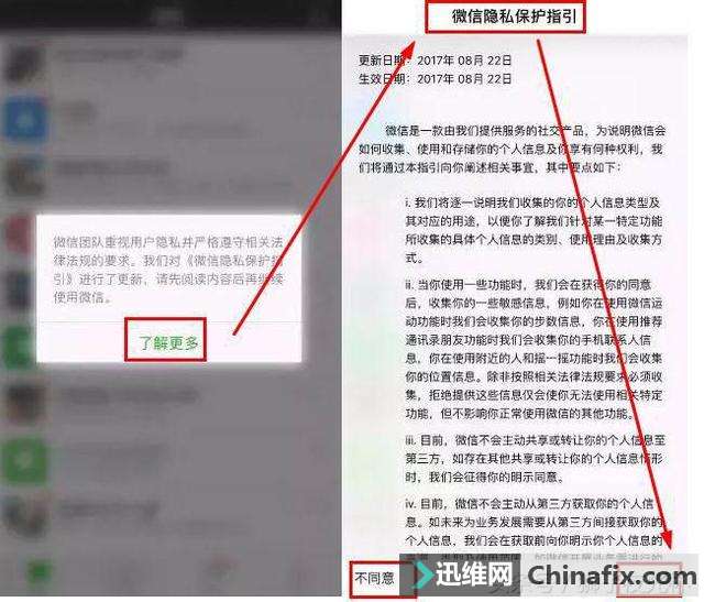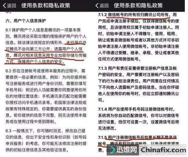 | 微信又更新了!嚷什么嚷,大谅小怪,市场竞争那么激烈,软件更新版本再正常不过。但是这次更新不一样,不一样在什么地方呢?先不要急,苹果系统微信最新版本为6.5.16,安卓系统最新版本为6.5.13.那么苹果系统版本6.5.16到底有什么改变呢? 1、iPhone手机更新微信版本到6.5.16后,再登录微信后,弹出一个“微信保护协议”,里面有一大串收集用户隐私协议的条款,只有点击右下角的“同意”才能正常运用微信。 2、这些要收集信息包括你的手机联系人信息、打开附近的人和摇一摇时的位置信息,微信运动时的步数等,这些可是我们个人的隐私信息呀!有些朋友看了过后有点激动,凭什么……,不过不要激动。微信不是你的微信,有什么办法呢?还是要耐下性子来继续看下去。 3、不过协议中说明了,未经用户许可,腾讯不会向第三方透露用户的个人信息;微信账号的所有权归腾讯公司所有;用户注册微信后,长期不登录账号腾讯有权收回账号。 4、有的朋友心里还是有点愤愤不平,偏偏点了一下”不一样意“,你想结果会怎样?结果将你”清理门户“,无权运用微信,哎呀,微信中有那么的好友,微信钱包中还有几W人民币……呵呵,微信一家独大,就这么牛,享受别人的服务,就要遵守别人的规则。 小编有话说:不管软件与用户之间出台什么新的协议,有的也是顺应国家政策的要求,只要我们做一个遵守规则、遵纪守法的好公民,就能更好享受高科技给我们带来美好的生活。 |