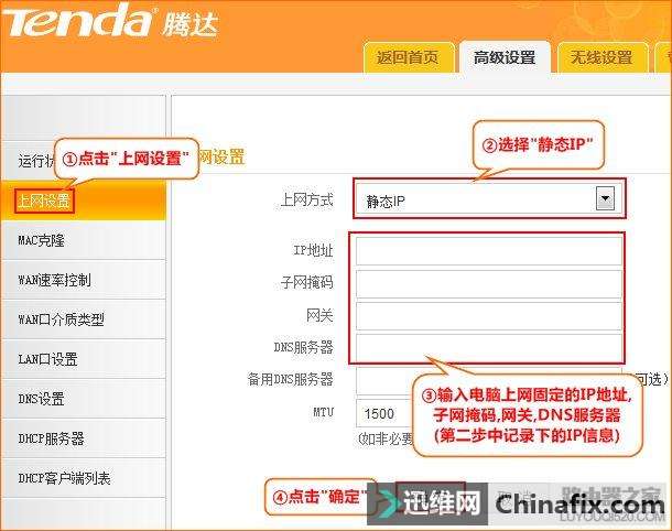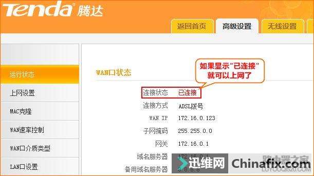 | 腾达无线路由器怎么安装设置?如何有线无线上网?本文针对腾达(Tenda)无线路由器产品,具体地介绍如何配置路由器上网的过程。 一、将路由器连接外网: 电话线接入的用户(请准备2根短网线) a.(有ADSL Modem猫) 将电话线(比较细的那根线)接猫的line口(比较小的那个口),猫分出来一根网线接路由器的WAN口 (蓝色),再找一根短网线,一头接电脑,一头接路由器1/2/3/4任意接口(黄色),接线方式如下图: 网线直接入户的用户 b、(无ADSL Modem猫)直接将入户的网线接在路由器的WAN口(蓝色),再找一根短网线,一头接电脑,一头接路由器 1/2/3/4任意接口(黄色),接线方式如下图: 注意:通电后,路由器正常工作状态是SYS指示灯闪烁,WAN指示灯常亮或闪烁,1/2/3/4口中与电脑相连的端口指示灯常亮或闪烁。如路由器相应端口的指示灯不亮或电脑的网卡图标显示红色的叉,则表明线路连接有问题,尝试检查下网线连接或换根网线试试。 将电脑上的本地连接IP地址设置为“自动获得IP地址”,win7以及其他系统参考:如何把电脑ip地址设为自动获得 1.右键点击桌面上的“网上邻居”,选择“属性”: 2.键点击“本地连接”,选择“属性”: 3.双击“Internet 协议(TCP/IP) 4.选择“自动获得IP地址”“自动获得DNS服务器地址”,点击“确定”再点击“确定”即可: 1、登陆路由器管理界面,在浏览器 中输入:192.168.0.1 按回车键。 192.168.0.1 打不开请阅读:路由器管理界面192.168.0.1打不开如何维修? 2、选择正确的上网方式进行设置(常见上网方式有PPPOE、动态IP、静态IP三种,不知如何选择上网方式请点击阅读:路由器上网方式怎么选择); ADSL拔号:在设置页面中选择“ADSL拨号”, 在“宽带用户名”、“宽带密码”中输入宽带运营商(例如:电信、联通等)提供的宽带用户名和密码 ,点击“确定”即可。 自动获得(动态IP):在设置页面中选择“自动获得”—点击“确定”即可。 静态IP:在设置页面点击“高级设置”-“上网设置”-选择“静态IP”输入网络运营商提供的上网固定的IP地址, 子网掩码,网关,首选DNS服务器,点击“确定”。 3、修改无线密码和无线信号名称 点击“无线设置”-“无线安全”,设置无线密码 在设置界面中点击“无线设置”—“无线基本设置”修改无线信号名称 点击“高级设置”-“运行状态”,如果WAN口状态显示“已连接”,就可以浏览网页,上网冲浪了。 温馨提示:通过路由器正常上网后,不需要再点击“宽带连接”,开机就可以直接上网;如果还有其他电脑需要上网, 直接将电脑接到路由器1234任意空闲接口,参照第二步将本地连接改成自动获得IP即可,不需要再去配置路由器。 如果上不了网推荐阅读:路由器设置好了但连接无反应网如何维修? 如果您还有笔记本、手机等无线设备要上网,请看下一部分无线设置。 无线设置: 请记住之前步骤三中无线路由器已修改的无线名称和无线密码,可点击"无线设置--无线基本设置"查看无线SSID (无线信号名称),点击"无线设置--无线安全"-查看无线安全密钥(第一次连接无线信号需要输入的密码)。 a: 如果要运用电脑来无线连接路由器,首先要保证您的电脑配有无线网卡并能正常工作,对不一样操作系统,其搜索并连接无线信号的方式如下: XP系统: 右键点击桌面上的“网上邻居”-选择“属性”-右击“无线网络连接”-选择“查看可用的无线连接” 在信号列表中选择无线路由器信号后点击“连接” 输入无线密码后点击连接即可。 Win 7/Vista系统: 点击桌面右下角的无线网络连接图标 ,在打开的信号列表中选择路由器的无线信号后点击连接按钮。 输入无线密码后点击确定即可 b、智能手机连接路由器的无线信号 Android系统: 打开智能手机“系统设置”菜单-点击“WLAN” : 启用WLAN功能后,选择无线路由器信号的名称连接,输入无线密码确定即可: IOS系统: 打开iPhone手机“设置”菜单-点击“Wi-Fi”: 启用Wi-Fi功能后,选择无线路由器信号的名称连接,输入无线密码确定即可: 按以上方式将您的无线设备连接路由器后,无线信号显示“已连接”就可以上网了。 |