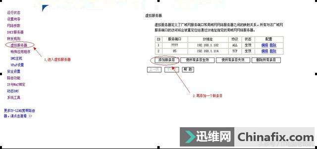 | 现实里好多企业需要管理不再一个地方的系统、这里用实列讲一下、如何把一个固定的IP地址做端口映射到内网电脑的过程: 客户现场环境: 客户用的是某款专业集中管理系统软件、安装在局域网内的IP地址为192.168.1.114的电脑,端口采用85(因为现在85等一些端口被运营商封掉了,大家可以自己选择端口)。 2、客户公司有一个固定IP地址,IP地址是: 120.33.235.2,此IP地址设置在公司的路由器上。所有电脑通过路由器访问外网。要求和需要是:做一个端口映射,系统管理软件访问120.33.235.2 这个服务地址,并可以直接访问到内网的192.168.1.114电脑。以下及时具体做法:1、输入路由器的IP地址(192.168.1.1),然后进入路由器登录界面,进入路由(如图) 进入设置页面 2、 进入路由器虚拟服务器界面添加一个新条目 3、按照以下添加即可。 这样固定IP的内网端口映射就完成了,如果大家对网络环境和稳定要求比较高,建议大家不要采用端口映射的方式来做,推荐大家用VPN模式,在稍后的文章给大家带上! |