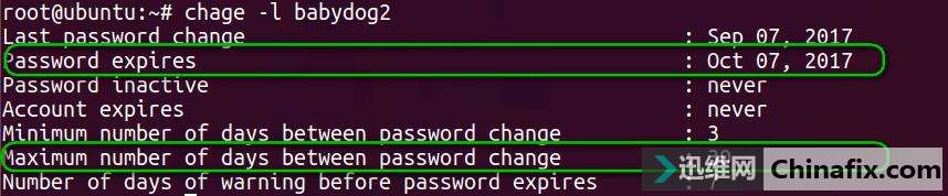 | 运用chage命令修改密码变更期限 框起来的部分的值是99999,这表示 babydog2 这个用户可以永远都不变更密码。如果长时间运用相同的密码,很容易造成密码的泄露。可以运用带有 -M 选项的 chage 命令设定 babydog2 这个用户的密码的最长运用30天之后就必须变更密码,这里 -M 中的M是指 maxdays . root@ubuntu:~# chage -M 30 babydog2 系统执行完以上命令之后不会有任何显示信息,应该运用带有 -l 选项的 chage 命令再次列出 babydog2 用户密码的所有信息: 结果清楚地表明 babydog2 用户的密码最长运用期限已经变成了30天,此时的 password expires 也变成了 2017年10月7日,正好是2017年9月7日之后的一个 月,随后,运用 tail 命令列出 /etc/shadow 文件中最后2行记录以观察显示结果中第5个字段的变化: root@ubuntu:~# tail -2 /etc/shadow babydog2:$6$DB8Q7an8$LGTZx9g/122XFE/iY2YL8iKH54EXvpVPSJ3LlwCpIc3YwJnVwV2CUjlAHr7HjtiAafyF4YqV4W9ZjysuPuO88.:17416:3:30:7::: 可以看出第5个字段已经从99999变为30,即这个用户的密码最长可以运用30天,即这个用户的密码最长可以运用30天之后就必须变更密码。 一些收费系统会有1个月的试用期,这样的系统的用户管理就可以运用今天介绍的 chage 命令来实现。 |