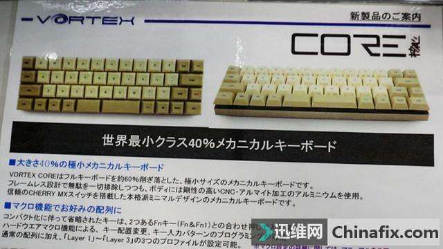 | 机械键盘爱好者们熟悉的ikbc,在国际上是以台湾Vortexgear闻名的。它最近推出了一款非常别致的机械键盘“Core”,47个按键的配列让它成为世界上最小的机械键盘。 尺寸为248×76.2×25.5mm的Core,去掉了数字小键盘和各种功能键、数字键,只保留了核心输入区,包括26个英文字母和20个功能键和分成了两块的空格键,还有个Fn键。正是借助这个Fn再配合Shift,就可以切换四种不一样的输入布局,实现其他功能键。 侧面来看,Core的键帽梯度几乎没有。 背部同样没有规划用来增加坡度的撑脚,看来这款键盘要在中国上市还需要一定的改变。此外,它还支持硬件宏功能,可以改变按键布局。 轴体部分,依然是配备Cherry MX原厂樱桃轴,分为红轴、茶轴、青轴、白轴四种版本,microUSB可拆卸数据线(长度1.8米)。 |