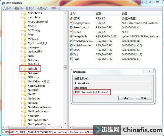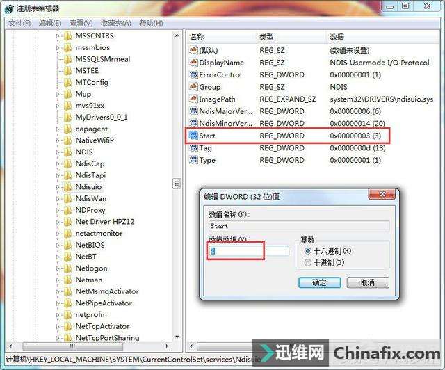 | 在Win7系统中,通常开机后就会自动连接网络宽带,不过有用户遇到问题。开机后网络图标显示红叉或者图标正常无法上网,打开网络和共享中心才发现是服务或者组无法启动,启动时显示错误1068,这该如何维修?下面一起来看看Win7系统宽带连接出现错误1068的搞定方式。 Win7系统宽带连接出现错误1068的搞定方式: 1、我们来Win7系统的桌面,点击开始在菜单中点击“运行”。 2、点击运行弹出来的运行窗口中输入“regedit”再点击确定。 3、点击确定弹出来的注册表编辑器窗口,在左侧按顺序点击“HKEY_LOCAL_MACHINE”“SYSTEM”“CurrentControlSet”“services”。 4、在services中找到“Ndisuio”点击,然后在右侧中找到“DisplayName”双击打开看数据数值是否为“NDIS Usermode I/O Protocol”。 5、再双击start项把数据数值改成“2”再点击确定。再创建一个二进制值,关闭注册编辑器就可以了。 以上就是Win7系统宽带连接出现错误1068的搞定方式,如果你也遇到此类问题,不妨参考上述方式搞定。 |