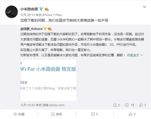 | 迅雷远程下载是小米路由器的杀手级功能,配合外接硬盘可以远程将下载到小米路由器硬盘当中,对于经常需要下载功能的用户来说可谓刚需。 现在迅雷已经关闭了第三方远程下载支持,不过小米路由器依然能够正常运用该功能,毕竟小米和迅雷是合作伙伴关系。 不过近日有小米路由器用户反馈小米路由器内置的迅雷下载功能无法运用,具体表现是PC端远程下载检测不到路由器,手机APP端迅雷服务亦无法运用。 对此,小米移动软件有限公司产品总监@桂麟_Katsura在微博表示小米已经联合迅雷搞定了这个问题,今晚会对硬盘版路由器用户推送专项搞定下载体验问题的固件升级,节后对小米路由器3、3G、PRO进行升级。 遇到该问题的用户可以在App端查看,检查升级。 |