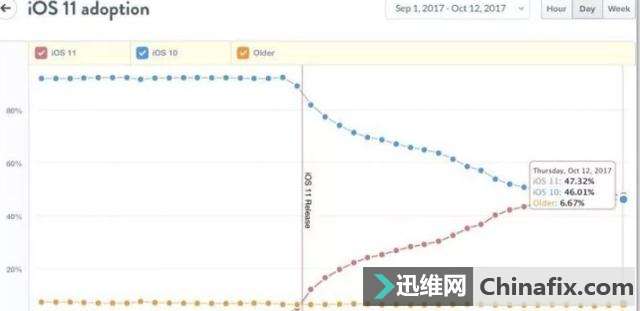 | 大家都知道苹果iOS系统有一个特别烦人的事情,那就是不让小伙伴们在各个系统版本之间来回选择。很多时候升级就降不下来了。比如现在最新的苹果iOS11系统,很多小伙伴升级体验后,发现不好用,可是想降级到苹果iOS10系统,为时已晚(现在仅iPhone6s可以降级到苹果iOS10.3.3系统,需要的小伙伴不要错过哦,需要运用DFU模式刷机)。 升级之后不能降级,所以苹果iOS11的安装率还是非常不错的。根据外国公司的统计报告显示,苹果iOS11升级到三个多星期以后,安装率已经达到了47%,成功超越苹果iOS10系统,也就是说,现在第一大系统是苹果iOS11,并非苹果iOS10。 从现在统计的数据来看,苹果iOS11的用户占比为47%,苹果iOS10的用户占比为46%。还有6.7%的iPhone设备运行的是苹果iOS9或者更早的系统版本。 虽然现在苹果iOS11安装率已经超过苹果iOS10,但是要比苹果iOS10超过苹果iOS9的速度慢了很多,苹果iOS10仅仅用了两周就超过苹果iOS9,而苹果iOS11在同期安装率仅仅只有38.5%。 苹果iOS11现在才第三个版本,所以有很多功能,细节都不是很完善。如果你是老款iPhone设备,建议大家先运用老版系统,等苹果iOS11优化到位在升级也不迟。 还有用苹果iOS9以前的小伙伴吗?举个手看看。 |