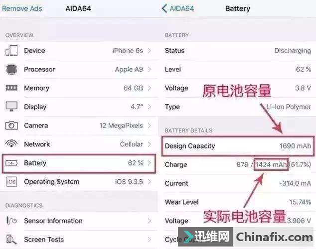 | 记得最近一段时间,升级了 苹果iOS 11 的小伙伴都在一致吐槽耗电严重的问题,你是不是也是其中一员呢? 升级之后,总觉得啥也没干,电量就嗖嗖嗖的往下掉。无非刷了下微博,看了看朋友圈,怎么那么快电量就低于 20% 了呢? 说到这里,小编就不得不站出来说句公道话了。没错,苹果iOS 11 相比 苹果iOS 10 确实耗电严重,就算是啥也不做,待机电池续航时间也比 10 短了不少。 不过,如果你发现自己运用 iPhone 的时间并不多,但一天还少不了 5-6 充的话,那你就别怨人家 苹果iOS 11 了,这该是手机电池损耗严重的问题了。 想要知道自己的手机电池现在损耗程度如何,那好,下面小编就教给你一些简单的方式: 如何自检电池损耗? 01、系统自检法 ● 系统升级到 苹果iOS 10.2.1 或以上的版本(系统版本已经达标的可省去这一步); ● 打开【设置】-【电池】,如果看到「iPhone 电池可能需要维修」,说明你的电池不健康,需要更换新电池;如果没出现该提示,则说明电池还没太大问题。 02、iPhone 诊断与用量 ● 苹果iOS 10.3 或更高版本 请前往“设置”>“隐私”,向下滚动并轻点“分析”。然后轻点“共享 iPhone 分析”。 ● 苹果iOS 8 到 苹果iOS 10.2 之间的版本 请前往“设置”>“隐私”>“诊断与用量”,然后选择“自动发送”。 注:如果手机默认的是不发送或关闭共享状态,点击自动发送/共享分析后,第二天才会收到数据。 第二天进入诊断与用量/分析数据,找到【log-aggregated】点击进入(选择最近的日期)。在打开的页面中,不要被密密麻麻的满屏数据吓到,只需要找到其中的一个数据就好了,建议倒着找。如图: 图中显示的 1400,则代表现在最大的电池容量为 1400m Ah。 03、下载安装 AIDA 64 进行检测 AIDA 64 是一款 Win 平台上非常出名的测验软硬件系统信息的工具,也有对应的 苹果iOS 版本,在 AppStore 搜索下载安装 AIDA 64 即可。使用首页是整体设备的信息,点击【Bettery】选项,可以检查电池状态。 图中电池原容量 1690 mAh,实际充满只有1424 mAh,那么电池损耗后容量值就是:1424/1690=84%。 如果是 90%~100%,电池损耗较小,影响不大; 如果是 80%~90%,会感觉到电池不如以前耐用; 如果是 80% 以下,显著感觉电池不耐用,就是时候换电池或者换手机了。 像这块电池,该换啦! |