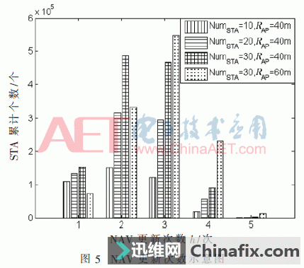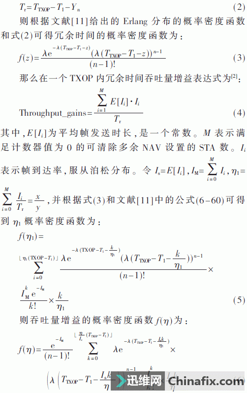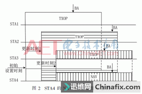 | IEEE 802.11协议利用RTS/CTS帧交换来设置设备的网络分配矢量(NAV)。现有NAV方案未考虑密集部署场景,可能存在误清除的情况。提出一种简便可行的可计数NAV(C-NAV)设置方案,通过统计NAV设置信息的个数并进行实时更新以防止误清除,从而更有效地利用传输机会。对所提C-NAV方案进行了理论分析和仿真验证,证明在密集部署无线WiFi场景中,该方案能有效避免现有设置方案NAV时长浪费和错误清除等问题,提升网络的整体吞吐量。 网络分配矢量;密集部署场景;传输机会;重叠的基础服务集 中图分类号:TN925.93 文献标识码:A DOI:10.16157/j.issn.0258-7998.170232 中文引用格式:何明泰,李可,刘恒. 密集无线WiFi网络环境网络分配矢量优化与性能分析[J].电子技术使用,2017,43(9):106-110. 英文引用格式:He Mingtai,Li Ke,Liu Heng. Optimized network allocation vector setting and performance analysis in dense 无线WiFi networks[J].Application of Electronic Technique,2017,43(9):106-110. 引言 随着无线网络技术的快速发展,移动终端和智能设备的数量迅猛增长,使无线网络环境变得越来越拥挤。尤其在无线WiFi网络热点处,已经出现了诸如容易掉线、网速差等现象,严重影响用户体验。 同时,人们对无线网络性能的要求却越来越高。为了满足用户需要,在下一代无线网络中,接入点(Access Point,AP)将会部署得越来越密集,最终形成一种新的网络形式——密集型无线WiFi网络。密集型无线WiFi网络是指场景中任意一个基础服务集(Basic Service Set,BSS)都有3个以上的重叠的基础服务集(Overlapping BSS,OBSS),即AP所拥有的邻居AP数远多于3个的无线网络[1]。 在无线WiFi网络中,为避免因距离远而不能感知正在通信的终端的存在,802.11协议提出了虚拟载波侦听机制,利用请求发送帧和清除发送帧(Request To Send/Clear To Send,RTS/CTS)交换来设置终端的网络分配矢量(Network Allocation Vector,NAV)。即在开始发送数据前,先发送RTS和CTS帧,这两个帧都含有NAV设置的信息,所有接收到这两个帧的终端根据协议判断是否需要设置NAV。 传统的NAV设置方案大多以传输机会(Transmission Opportunity,TXOP)来设置,设置的时间一般较长,这意味着会浪费较多的信道利用机会。而现有改进的NAV设置方案虽然能够克服时长浪费的问题,但在密集型无线WiFi网络环境下依旧存在误清除的情况。误清除可能会造成终端过早接入信道,与正在通信的终端发生碰撞,从而影响网络整体吞吐量。因此,提出一个适用于密集型无线WiFi网络场景的NAV方案就成了搞定碰撞和时长浪费问题的关键。 近年来,已有一些文献[2-9]提出了改进的NAV设置方案以提升系统性能。主要包括以下几个方面的内容: (1)基于传统的NAV设置方案进行改进以搞定时长浪费的问题。例如文献[2]中提出的两层网络分配矢量方案(Two Level NAV,TLNAV)。该方案是通过用块确认帧/块确认请求帧(Block Acknowledge/Block Acknowledge Request,BA/BAR)中的保留字段携带最后一帧信息来清除冗余的NAV设置,以搞定因多用户MIMO(Multiple Users Multiple Input Multiple Output,MU-MIMO)给系统带来的TXOP时长浪费问题。 此方案没有考虑密集场景的情况,仍有可能无法避免干扰,甚至造成干扰加剧。文献[3]中通过两级载波侦听机制OBNAV(Overlapping BSS NAV)和SBNAV(Self BSS NAV)来搞定OBSS的干扰问题,但保持多个NAV的方式需要传输更多的帧[4],会增加额外的通信开销。 (2)根据STA传输的业务类型[5]和数据包[7]不一样、或运用的协议类型[6]不一样来设置不一样的NAV。文献[5]根据终端传送的是数据还是语音信息来设置对应的NAV值。语音信息则设置较短的NAV值,而数据信息则多加一个优先接入时长作为其NAV值。文献[6]通过对运用802.11g的高速STA设置较短的NAV值,保证高速STA的吞吐量不低于运用802.11b的低速STA的吞吐量,确保系统整体吞吐量不受相同的NAV设置策略的影响,搞定了不一样协议类型的STA的共存问题。文献[7]通过仿真比较了传输每一个数据包独立设置NAV和传输多个数据包一次设置NAV的吞吐量不一样,并证明在没有NAV清除机制的情况下,传输每一个包独立设置NAV的吞吐量优于多个包一次设置NAV。但分类设置要求AP对其关联的每一个STA都进行分类管理,增加了系统管理的复杂度。 (3)通过改进RTS/CTS发送机制来减少无用的NAV设置。文献[8]采用一种替代RTS/CTS的机制——带冲突避免的媒质接入(Media Access with Collision Avoidance,MACA)机制。该机制实质上是缩短了NAV的时长,减少了时长浪费,但是该方案需改变现有的RTS/CTS机制。文献[9]提出一种由发送端主动发送 “取消”帧来清除无用的NAV设置的方案,以减少不合理的NAV设置带来的时长浪费问题。由于每个“取消”帧仅对一个STA的NAV进行清除,当存在多用户时,特别是在MU-MIMO场景下依旧存在时长浪费的现象。 综上所述,现有NAV设置方案并不适用于密集无线WiFi网络场景,现在针对密集无线WiFi场景的NAV设置方案的研究还存在不够。因此本文提出了一种可计数的网络分配矢量(Countable-NAV,C-NAV)方案,以搞定密集无线WiFi网络场景带来的时长浪费和误清除问题。通过理论分析和仿真结果证明:该方案能有效避免传统NAV设置带来的时长浪费和已有改进设置方案可能带来的NAV错误清除,从而提升了网络的整体吞吐量。 1 NAV设置的问题和C-NAV方案规划 在密集场景下,一个终端(AP或STA)在一段时间内会接收到多个NAV设置信息,当终端上电后接收到第一个NAV信息,自然将其作为NAV值设置。在收到第二