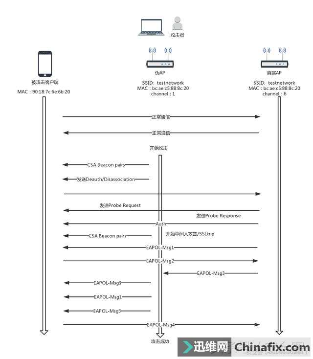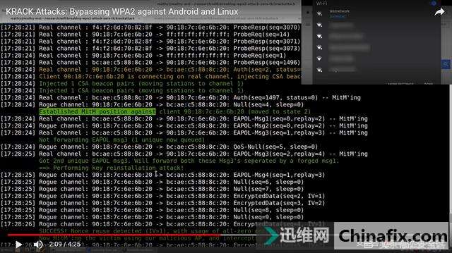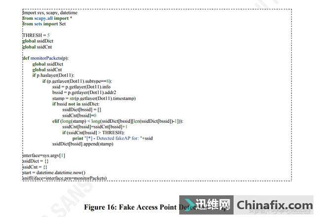 | 近日,有安全研究员披露 WPA2 协议层中存在逻辑缺陷,几乎所有支持Wi-Fi的设备都面临威胁,其传输的数据存在被嗅探、篡改的风险。攻击者可获得无线WiFi网络中的数据信息,如信用卡、邮件、账号、照片等,危害巨大。对于用户而言,应该关心设备厂商安全公告,及时更新修补漏洞。而对于企业而言,除了督促员工尽快更新设备外,还可以利用WIPS产品来帮助抵御KRACK攻击等无线安全攻击威胁,保护企业内部的WiFI设备安全。 本文将以KRACK攻击为例,介绍WIPS产品为何能快速支持KRACK攻击检测并进行防御。 2.什么是WIPS WIPS(无线入侵防御系统)是针对企业无线使用环境的安全威胁发现与防护系统,通过将无线通信技术、无线攻防、数据分析与挖掘等技术相结合,确保企业的无线网络边界安全、可控。 较为出名的WAIDPS,便是一款由Python编写的无线入侵检测工具,基于Linux平台,完全开源。它可以探测包括WEP/WPA/WPS在内的无线入侵&攻击方式,并可以收集周边无线WiFi相关的所有信息。 2.1WIPS(无线入侵防御系统)基本架构 WIPS通常采用采用B/S或者C/S架构,收发引擎分布式部署在企业办公环境中,将收集到的热点信息传给中控服务器。管理员通过通过管理平台查看企业内部热点信息,对捕获到的攻击行为进行告警,并对恶意、违规的热点进行阻断。 2.2.基本功能 利用WIPS产品可以查看并管理企业内可信热点、未知热点;识别并告警可疑攻击行为;快速响应无线WiFi攻击及威胁事件。能够有效防止恶意热点、未知及外部热点、伪造热点、未授权移动终端等可能带来的安全隐忧,从而保护企业的无线网络安全。 分布式部署在企业办公环境中的收发引擎将会回收整个区域内所有802.11原始数据并进行分析识别,如:热点、客户端识别回收热点、客户端BSSID、ESSID、PWR、OUI & Loc等信息。判断并标记恶意热点、未授权热点、错误配置热点(弱密码、有漏洞的加密协议)。发现客户端未授权连接。 攻击行为识别检测MDK3去认证攻击检测伪造合法热点攻击检测伪造MAC地址攻击检测Aircrack-NG无线pojie攻击 2.3.无线攻击识别规则 由于后文对KRACK攻击的检测方式涉及检测伪造热点,此处便以此为例进行说明。伪造热点攻击(Evil-Twin)是众多无线攻击方式中,成本较低、效果较好的一种,因此及时地发现并阻断钓鱼热点是非常必要的。常见的伪造热点攻击检测方式有:热点常规信息检测、登录凭证验证检测、时钟偏差检测等方式。 常规信息检测 利用目标AP的Beacon、Interval、SSID、Channel及其他无线信息进行比较得出判断。 凭证验证检测 利用AP登记保存的凭证信息向目标设备发起连接,若成功再用错误密码尝试连接,若提示错误则证明是合法热点。 时钟偏差检测等方式 通过计算两个相邻信标帧之间的timestamp间隔不一样,即时钟偏差,与预先设定的阈值进行比较来检测伪AP。如果AP的时钟偏差值与特征库中储存的偏差值不一样,则可认定这个AP为一个无线钓鱼AP。 如上图就是一个Python利用Scapy模块以实现通过时钟偏差检测识别钓鱼热点的示例 3.KRACK攻击原理分析 本次的WPA2“密钥重装攻击”,基本原理为:利用WPA协议层中的逻辑缺陷,多次重传握手过程中的消息3从而导致重放随机数和重播计数器,为攻击者提供了利用条件。 在协议标准中还存在一条危险的注释“一旦安装后,就可从内存中清除加密密钥”,若按此注释进行实现,在密钥重装攻击时会从内存中取回已经被0覆盖的key值,从而导致客户端安装了值全为零的秘钥。而运用了含漏洞wpa_supplicant版本的Linux及Android设备便因此遭受严重威胁。 3.1.KRACK攻击利用方式(攻击视频分析) 1、首先测验设备连接真实的testnetwork网络: 2.开启WireShark监听并在稍后被设为钓鱼热点的网卡: 3、 攻击演示: 真实热点Real AP: SSID:testnetwork Mac:bc:ae:c5:88:8c:20 Channel:6 被攻击客户端Target: SSID: 90:18:7c:6e:6b:20 伪造同名同MAC热点(Rouge AP): SSID: testnetwork Mac:bc:ae:c5:88:8c:20 Channel:1(信道不一样) 注入CSA beacon pairs 将客户端信道变为1,也就是迫使客户端Target与Rouge AP通信。伪AP向目标Target发送Disassociate数据包,使其解除关联。 4.利用网卡建立目标AP的伪造热点,迫使客户端连接到伪造热点上。此时设备经历重连,WiFI状态为正在认证。 当目标targe与真实AP完成认证过程,准备发起连接时,注入CSA beacon pairs,使信道切换到Channel 1 实施中间人攻击,同时客户端状态保持在State 2,接下来开始发送四次握手中的Message 3,实施密钥重新安装(Key Reinstallation Attack)攻击。 5.此时密钥重装攻击已经执行成功,客户端已连接上伪造热点: 6.在此伪造热点中,被攻击端所有流量皆可被嗅探、篡改;演示视频中运用经典的MITM工具sslstrip对HTTPS进行降级,便可获得用户传输的明文账号信息。 7、用户提交的账号信息便可被获得: 3.2.检测KRACK的几种途径 之前有讲到KRACK的攻击原理,根据现有KRACK的Demo来看,攻击者的主要利用方式为:在被攻击客户端与正常AP建立连接时,攻击代码(POC)“克隆”了被攻击客户端所连接的AP,建立了一个相同BSSID、ESSID,但Channel不一样的热点;通过发送Disassociate Frame迫使被攻击客户端解除关联,此时设备经历重连;准备重新与正常AP发起连接时,注入CSA beacon pairs(Channel Switch Announcement),使信道切换到恶意AP所在信道,实施中间人攻击;同时客户端状态保持在State 2(通过对访问点进行身份验证的身份验证状态),接下来开始发送四次