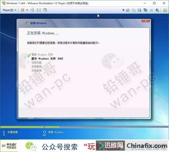 | 很多朋友在后台询问小编怎么安装虚拟机,虚拟机用处非常多,比如游戏多开、测验软件等等。铅锤哥干脆也写篇教程出来吧,因为现在运用虚拟机真的很简单了。 先用官方语言解释下虚拟机: 虚拟机(Virtual Machine)指通过软件模拟的具有完整硬件系统功能的、运行在一个完全隔离环境中的完整计算机系统。 简单点就是: 基于你系统里的另一个独立的系统,这个系统里所有的东西都是外面的系统给的(处理器、内存、硬盘等等)。 会玩的朋友,甚至可以玩多层虚拟机,这概念就有点像盗梦空间了。 废话不多说,下面开始。 需要准备的东西: 电脑——至少有一个盘剩余空间大于60G 下载原版Win系统ISO文件备用 ——【点这里查看如何下载】 下载并安装好 VMware Workstation 12.1.1 Player(免费) VMware Workstation 12.1.1 Player下载地址: http://pan.baidu.com/s/1mh5P9EC 下面开始安装一个64位Win7系统的虚拟机: 首先,打开安装好的 VMware Workstation 12.1.1 Player,选择“创建新虚拟机”。 然后,在弹出的“新建虚拟机向导”里,选择“安装程序光盘映像文件”,并打开之前准备好的“系统ISO安装文件”,然后点击“下一步”按钮。 在下拉框选择要安装的版本,这里铅锤哥选了“Win7 Professional”版本,继续“下一步”。 这里要选择虚拟Win7系统文件保存的位置,要确保这个盘有足够空间存放文件(建议空余60G以上),铅锤哥这里放在了F盘下,继续点击“下一步”。 选择分配多少容量给虚拟机,一般默认60G即可,继续“下一步”。 最后检查一下配置有无错误,没问题的话,点“完成”。 然后,会进入自动安装程序,不需要操作,耐心等待即可。 看到这个画面,虚拟机系统就已经安装完毕了,虚拟机就是一个完整的电脑,也需要激活系统,也需要安装软件,接着该干嘛就干嘛去吧。 温馨提醒: 虚拟机的配置是由主机分配出来的,如果你的内存或者硬盘足够大,可以适当分配多一些资源(处理器、内存,硬盘)给虚拟机,增加虚拟机的流畅度。 也可以调整虚拟机的网络配置,默认是“NAT”模式,有需要可以换成“桥接”或者其他模式。 另外,建议进入系统后,安装Vmware Tools工具,会方便很多。 具体方式如下: 免费版本的 VMware Workstation Player 一般都能满足大家的基本要求了,如果有更高级需要的朋友,可以考虑购买 VMware Workstation Pro 或其他版本,价格不便宜哦。 |