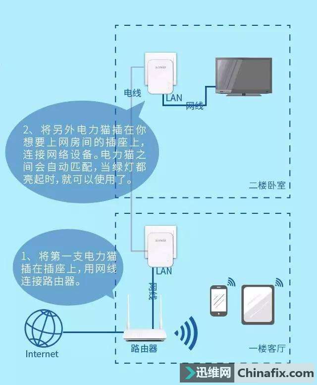 | 你听说过电力猫吗?没听过?不知道?电力猫是一种通过电力线进行网络传输,实现信号放大覆盖与扩展的神器。那么电力猫怎么用呢?下面小编腾达PH3电力猫为例,给大家介绍一下电力猫的使用方法,以供参考。 电力猫怎么用 图1 电力猫运用家庭或办公室现有的电力线和插座组建成网络,用它连接PC, modem,机顶盒,音频设备,监控设备以及其他的智能电气设备,方便传输数据,语音和视频。电力猫具有免布线、即插即用的特点,能通过普通家庭电力线传输网络信号。 电力猫怎么用 图2 电力猫怎么用 图3 电力猫怎么用 图4 下面以腾达PH3电力猫为例,分享一下电力猫的运用方式。 电力猫怎么用 图5 1. 电力猫A通电,用一根网线将路由器LAN口与电力猫A连接起来。 2. 把电力猫B插到您想要扩展网络位置附近的墙插/排插上。正常情况下,电力猫通电后1分钟内会自动组成电力线网络,此时PLC指示灯会变为绿色常亮。 电力猫怎么用 图6 温馨提示: 若电力猫自动配对不成功,则需进行手动按键来组网,建议将两个电力猫放到同一个插上方便组网操作。 首先按着电力猫A的Pair按钮1~2秒,此时电力猫A的 PLC指示灯会闪烁。然后按着电力猫B的Pair按钮1~2秒,此时电力猫B的 PLC灯也会闪烁,待两个电力猫的PLC指示灯变为绿色常亮就说明手动组网成功。最后把电力猫A连接路由器,电力猫B放置在你想扩展信号的墙插上即可,请根据实际网络环境可与电脑PC连接也可以与网络电视连接。 |