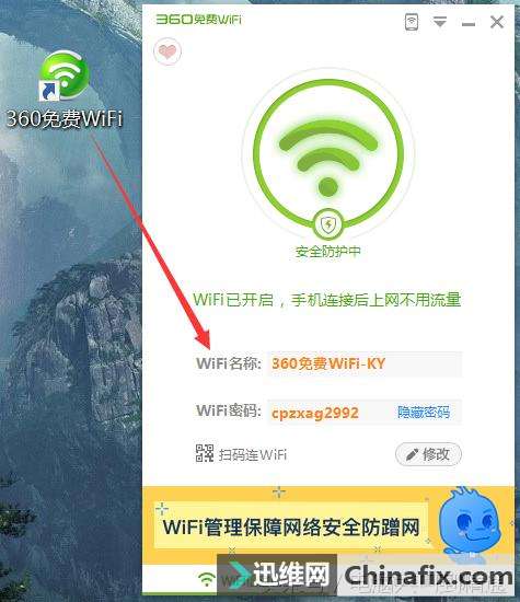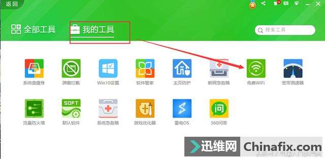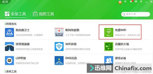 | 软件适用场景:收到其他维修同行的一台能上网的笔记本或是装了无线网卡的台式电脑,你自己没有无线路由器,你身旁没有可用的wifi,像出租屋,学校宿舍,没有WIFI的办公场所等;而你的手机,IPAD又需要连接无线WIFI上网。那么你可以用用这个小办法自己创建一个免费的WIFI。免得天天去蹭网了。 这类软件常用的有360免费WIFI,腾讯电脑管家上wifi共享精灵,金山卫士的一键Wi-Fi共享,160wifi 等。运用都比较简单,装好后通过一键设置,就能创建一个免费的WIFI。下面来看看360免费WIFI的运用演示。 1、首先打开360安全卫士界面,在右下角点击更多,进入到所有工具管理界面。 2、在所有工具界面,往下拉一点,在网络优化栏目,找到免费WIFI。点击一下,就会自动下载安装。 3、装好以后,在我的工具里就可以看到刚装的免费WIFI了,已经自动创建了一个免费的WIFI共享,同时电脑桌面也会创建一个快捷方式,电脑右下角有个无线图标。 已经自动创建好的WIFI账号密码。 就是这么简单,现在你可以拿出你的手机来连接无线WIFI了。WIFI名称和密码也可以修改成简单的好记的。 其他同类型的软件像腾讯电脑管家,金山卫士的WIFI共享软件,一般都是在工具箱,百宝箱里找。也是很简单的一键设置。在学校宿舍,出租屋等环境下,你有收到其他维修同行的一台只能用网线上网的笔记本,没有无线路由器,又想手机也能免费WIFI上网,那就用下这个简单的小办法吧。 |
