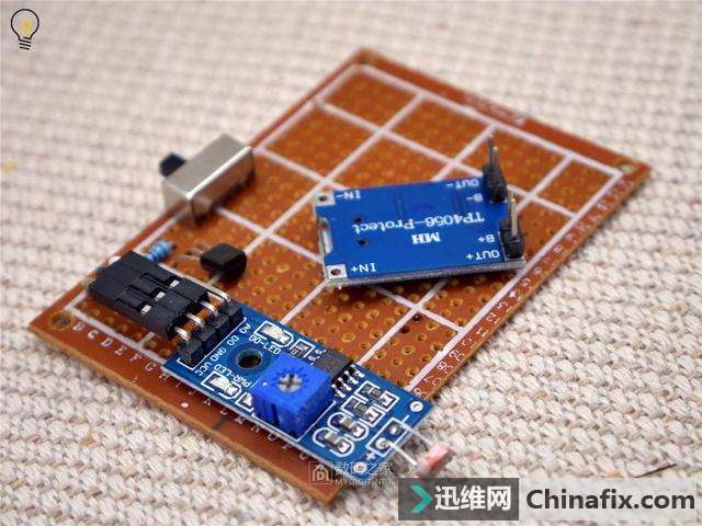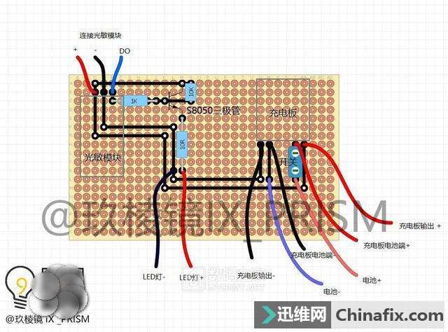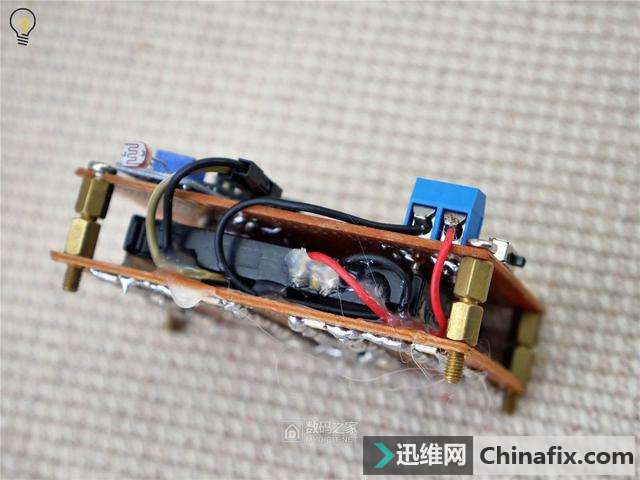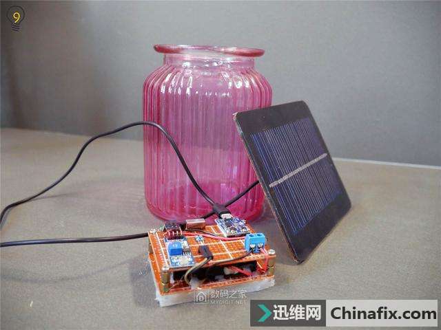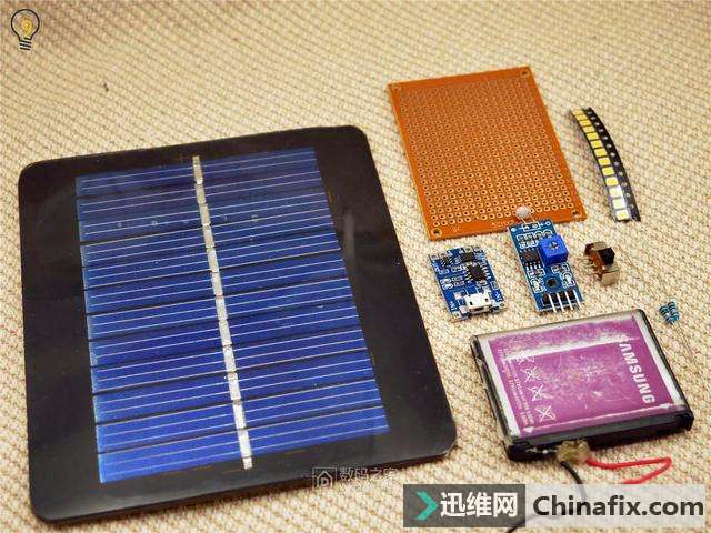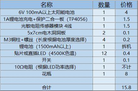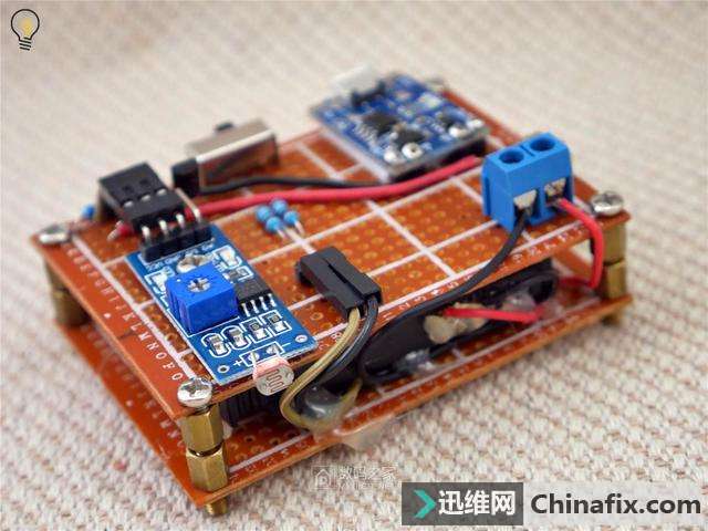 | 当你晚上摸黑走进家门的时候,有没有想过为自己家里添置一款不用插电,一到夜晚就会自动开启照明的灯?温暖的灯光映衬着窗台边苍翠草木,既省去了摸黑找开关的麻烦,又能为家中添加不少氛围,亲戚朋友上门时还可以顺道吹一番,可谓是一举三得。 教你DIY手工制作无需充电的太阳能窗台灯 图 -太阳下山之后,太阳能灯便发出温暖的光芒 准备及材料 本次DIY手工制作依旧有一定的难度,你需要拥有的技能: 至少高中的物理学,电学知识,能搞清楚串并联以及电阻,电压,电流的换算,了解三极管等基础半导体元件的特质 摸过电烙铁,会运用焊锡丝进行一些简单的拖焊及线路连接 拥有电烙铁、镊子、尖嘴钳、热熔胶枪等工具 会前往购物网站采购元器件 下面是DIY手工制作所需要的材料,整个DIY手工制作下来只需要不到20元,大量采用现成可以直接买到的模块以降低难度,并且部分材料(比如电池、花瓶)可以废物利用。 教你DIY手工制作无需充电的太阳能窗台灯 图 -材料的实拍 材料采购清单(不含工具及粘合剂、电线、细绳、焊锡丝等材料) 教你DIY手工制作无需充电的太阳能窗台灯 图 开始制作 在开始之前确认好自己有足够的工具,比如剪刀、电烙铁、尖嘴钳、热熔胶枪等等,如果没有的话这一套工具买下来也不贵,能控制在50元以下,况且还能多次运用 在洞洞板上焊接贴片LED难度较大 1.用电烙铁将LED牢牢地焊在第一块洞洞板上(并联),这个过程比较复杂,如果嫌麻烦的话可以在购物网站上找一些现成的灯板,甚至可以找带有恒流驱动的LED板,这种情况下只运用三个现成的模块(充电、光敏、LED)就能完成整个制作。 -运用杜邦线能够进行热插拔连接 2.准备好几条杜邦线(也可以直接焊接)来将光敏模块连接到第二块洞洞板上,需要连接电源两极和数字信号输出端。 -将光敏模块焊接上去 2.将光敏模块焊接到洞洞板上之后,由于模块输出能力不够,需要额外添加一枚三极管进行扩流(运用S8050即可)这里需要你能对三极管基极(B)、集电极(C)、发射极(E)有所了解,如果无法正常工作则可以添加一枚10K的上拉电阻(用电阻将B极与电源+连接)。 -接线方式如图所示 -用手钻开孔 3.此时我们发现光敏模块无法直接固定在洞洞板上,因此运用手钻进行开孔,并且用螺丝固定 -用螺丝固定 教你DIY手工制作无需充电的太阳能窗台灯 图 -用泡棉胶带+排针固定充电保护二合一板 4.而在固定充电+保护二合一板时,发现其连螺丝孔也没有,只得运用泡棉胶带+焊接排针的方式进行加固,难度较大,当然你也可以直接运用飞线连接之后再用胶水粘住 -这样做完之后正面还是挺简洁的 5.如图,将所有元器件安置到位,尽量将飞线之类的东西藏到板子背面(铜箔面)使得正面尽量简洁。 -背面走线及条线安置 教你DIY手工制作无需充电的太阳能窗台灯 图 -铜柱能够轻松的安装和拆卸,并且看起来比较美观 6.接下来开始处理LED板,先运用铜柱垒起一个比电池稍高的空间,这样就能把电池固定在中间。 教你DIY手工制作无需充电的太阳能窗台灯 图 -运用泡棉胶带将电池固定在中央 -上下两块洞洞板组合在一起 7.最后将上下两部分组合,主体就完成的差不多了,已经能开机进行测验,记得在此时将光敏模块的灵敏度调整至合适,可以在拉上窗帘的室内运用台灯进行测验。 教你DIY手工制作无需充电的太阳能窗台灯 图 -电池被完美地隐藏在中央 -乳白色的亚克力板可以柔化光线 8.接下来截取一块大小同为5x7cm的3mm亚克力片,最好选择乳白色带有磨砂的亚克力板,当然你也可以运用一张A4纸或者磨砂塑料薄膜,只是没有那么坚固美观而已。 教你DIY手工制作无需充电的太阳能窗台灯 图 -运用热熔胶固定住亚克力板 这时打开开关,将灯放在黑暗处,他应该已经能够发出温暖而柔和的光线了,至此已经完成80%的工序,只剩下太阳能电池和作为遮羞罩的花瓶没有动工了。 -环境光变暗时,灯光就会自动亮起 教你DIY手工制作无需充电的太阳能窗台灯 图 -太阳能电池还能为手机充电 太阳能电池的处理很简单,找一条不用的Mirco 数据线(老的安卓手机线)将比较大的USB-A口剪掉,只留下Mirco口,再将其正负极对应焊接在太阳能电池上即可,由于运用的太阳能电池是6V电压,他还能拆下来为手机、充电宝等设备充电,当然功率就比较小了,只有0.6W左右(也可以选择功率更大的太阳能电池,但切记电压要选择5.0至6.0V之间的) -运用热熔胶将线固定防止焊点脱落 教你DIY手工制作无需充电的太阳能窗台灯 图 花瓶建议选择矮小带有颜色的,也能运用灯笼等有创意的透光物品,但要能塞得下主机 三大件已经准备就绪,接下来我们就开始总装吧,为了将主体部分固定在花瓶的上部,取4条带有塑胶外壳的粗单芯电线,并用热熔胶将其固定在主机的四个角落。 -带有塑胶外壳的电线相比铜丝更容易被热熔胶黏附 将主机放入花瓶,弯曲四根铜电线来使其悬空,注意保持水平 -这样固定在问题时能非常容易的取出维修 运用热熔胶将太阳能电池与铜线粘合在一起,接着取一条麻绳(也可以运用塑料绳)在瓶口缠绕两圈并从两端引出一截线,使得太阳能灯能挂在物体上。 教你DIY手工制作无需充电的太阳能窗台灯 图 -麻绳或纸质绳十分美观,但要注意长期日晒会使其容易断裂 此时作品已经完成,来欣赏一下 教你DIY手工制作无需充电的太阳能窗台灯 图 -太阳能电池与花瓶颜色正好