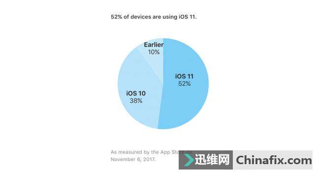 | 11 月 8 日消息,苹果今天在其开发者网站支持页面公布了 苹果iOS 操作系统占有率相关的统计数据。官方数据显示,截至 2017 年 11 月 6 日,苹果iOS 11 安装率已经达到 52%。 据了解,这是自 苹果iOS 11 系统的正式版本发布以来,苹果官方首次公布这个最新操作系统的安装数据。数据显示,苹果iOS 10 安装率紧随其后占 38%,现在 苹果iOS 11 与 苹果iOS 10 这两个版本已经占据了九成的 苹果iOS 设备。不过依然有 10% 的设备在运行 苹果iOS 9 或更老旧的系统。 现在苹果已经发布了 苹果iOS 11 的首个重大更新 11.1 正式版,苹果iOS 11.1 正式版引入了全新的表情符号,通过 3D Touch 按压屏幕边缘切换后台使用的功能重新回归。苹果在今天凌晨还上线了苹果iOS 11.2 的第二个公测版,新增Apple Pay Cash(个人转账),并修复了字母 i 变 A 的 Bug。 |