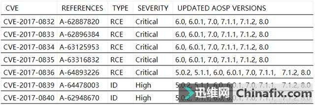 | 今天,谷歌发布了2017年11月份安卓系统漏洞公告,在不够十天的时间内,安卓系统总共被发现31个漏洞,其中9个为远程代码执行漏洞。 11月安卓系统漏洞:31个不得不修复的漏洞 公告中详细列出了三个不一样时期的漏洞修复情况: ·2017年11月1日至11月5日期间,修复了所有严重和中危漏洞 ·2017年11月6日修复了高危KRACK漏洞 2017年11月1日、2017年11月5日、2017年11月6日,所有安卓合作伙伴都收到了漏洞修复的通知。关于这些漏洞的源码补丁将会在48小时内公布在安卓开源项目(Android Open Source Project (AOSP) )知识库中。 11月1日共修复了11个漏洞,其中6个严重的远程代码执行漏洞、3个高危的提权漏洞,2个高危的信息泄露漏洞。这些漏洞大部分影响到的都是Media框架。 11月安卓系统漏洞:31个不得不修复的漏洞1 1月5日也是修复了11个漏洞,其中3个严重的远程代码执行漏洞、7个高危的提权漏洞、1个高危的信息泄露漏洞。高通组件受影响最深。 11月安卓系统漏洞:31个不得不修复的漏洞 11月6日修复了9个和KRACK攻击相关的漏洞。 从10月份开始,谷歌就决定分开公布 Nexus设备和Pixel 设备的漏洞了。11月份,这两款设备上共被发现50余个漏洞,受影响的组件有Media 框架、运行时间、系统、内核、MediaTek、NVIDIA、高通组件等。 |