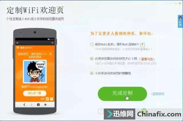 | 我们在商场或者门店里运用商家的无线WiFi的时候,都会首先在手机上出现一个无线WiFi界面,上面一般是商家的营销活动,想用商家的免费无线WiFi,首先先看一下商家的广告。 那么这些广告或者页面提示语在自己的无线 WiFi上能不能设置呢?再或者,我能不能用这个设置撩一下用我无线 WiFi的女神或者恶搞一下好友呢,小编就教你这招。 这种无线WiFi设置有很多插件,这里我们运用猎豹浏览器的无线 WiFi插件,首先在猎豹浏览器扩展程序里下载“免费无线网”。 下载完成后,在任务栏右下角会默认的无线WiFi账户和名称。 点击右侧即可修改,比如你的女神叫迪丽,那么可以把无线WiFi账户名改为“迪丽,这个密码是8个8”,然后发布,接着点击“百宝箱”,点击“无线WiFi欢迎页”,设置后会出现如下界面。 在这里即可设置连接这个无线WiFi后出现的欢迎页,选择其中一个模板,然后点击编辑,即可设置其图片、欢迎语等内容。并勾选“必须浏览器访问欢迎页才让上网”,然后点击完成定制。 接下来不管是手机还是电脑,只要连接这个无线WiFi,就必须先运用浏览器登陆出现这个欢迎界面才能上网。 运用这个技巧,你还可以恶搞任何用你无线WiFi的好友,如果你是商家,还可以将这个欢迎页设置成你的广告宣传语。所以这个无线WiFi技巧不管对谁都是非常讨巧的。 |