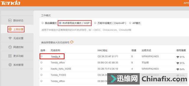 | 在教程讲解前,先来说说路由器无线桥接的好处,无线桥接主要作用是扩展无线WiFi信号,扩展无线WiFi后,令原本覆盖不到无线WiFi的地方也可以有无线WiFi,免去布线的烦恼。两个或多个无线路由器桥接到一起,可以实现无线WiFi信号的全覆盖。 本教程将以腾达路由F9为例讲解两种路由器无线桥接的方式,热点信号放大模式和万能中继模式。 首先你必须要有两个路由器,两个路由器我们分别称为主路由和副路由,主路由一般连接着光猫(modem)或入户宽带网线,能连接互联网,副路由用来桥接主路由的无线WiFi信号。 路由器无线桥接详细图文教程 图 第一步 设置主路由 设置好主路由正常连接到网络,一般情况下,主路由都是已经能正常上网的,因此这里就不再讲解路由器怎么设置上网了。 不知道的亲可以戳这里>>路由器设置上网教程 我们只需要知道主路由的无线WiFi名称和密码就可以了,假设主路由的无线WiFi名称为“Tenda_A”,无线WiFi密码为12345678000 第二步 设置副路由 1.首先进入副路由的设置界面。电脑用一根网线连接副路由的其中一个LAN口,或者用手机/电脑/平板连接副路由的无线WiFi。 路由器无线桥接详细图文教程 图 2.在电脑/手机打开任意一个浏览器,在地址栏输入www.tendawifi.com或192.168.0.1(或者是自己设置过的管理IP地址),如果副路由(腾达F9)之前没有设置过,那么界面将是下面样子的▼ 选择“动态IP”,修改无线名称和密码,然后按确定即可。 3.点击【上网设置】——工作模式选择【热点信号放大模式(WISP)】或【万能中继模式(Client+AP)】,请根据自己的需要选择相应模式。 选择【热点信号放大模式(WISP)】是这样样子的▼(看不清请点击图片查看高清图) 路由器无线桥接详细图文教程 图 选择【万能中继模式(Client+AP)】是这样样子的▼ 4.选择主路由的无线WiFi信号(Tenda_A)后,输入主路由的无线WiFi密码(12345678000),点击【连接】。 路由器无线桥接详细图文教程 图 5.此时副路由会自动重新启动,待重新启动完后,检查联网状态,如果显示“连接成功”则表示副路由已经成功跟主路由桥接成功。 路由器无线桥接详细图文教程 图 温馨提示 1.当选择WISP模式进行桥接时,副路由重新启动后会自动检测IP是否冲突,若出现IP冲突提示,请直接点击确定即可。如果你的路由器本身没有自动检测IP冲突功能,那么在设置前请确认好主副路由的管理IP分别是多少,原则为:例如主路由的管理IP(LAN IP)为192.168.0.1,副路由的管理IP必须为192.168.X.1(X=1~254) 2.当选择Client+AP模式进行桥接时,副路由重新启动后,LAN IP会自动变为与主路由同一个网段,并且不能更改,连接副路由的设备均由主路由分配IP地址。例如:主路由LAN IP为192.168.0.1,副路由LAN IP将变成192.168.0.X (X=2~254)。 3.本教程适用于腾达所有具有“万能桥接”功能的路由器,同样也适用于其他品牌的路由,方式区别不大。 |
