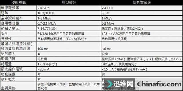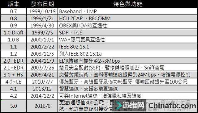 | 无线网络使用广泛,衍生如红外线、蓝牙、ZigBee、ANT、NFC、UWB、LiFiTransferJet……短距离无线技术。随着物联网的使用慢慢受到瞩目,成本低廉、使用广泛的蓝牙(Bluetooth)技术深受瞩目。 蓝牙(Bluetooth),是一种\无线个人局域网(Wireless PAN),最初由Ericsson创制,刚开始中文被叫做【蓝芽】,后来由蓝牙技术联盟(Bluetooth SIG)订定成全球技术标准,正名为【蓝牙】。蓝牙这个词的来源是10世纪丹麦和挪威国王蓝牙哈拉尔(丹麦语:Harald Bltand Gormsen),借国王的绰号Bltand当名称,直接翻译成中文为蓝牙(bl=蓝,tand=牙)。蓝牙版本由最早的1988年的0.7版到2016年6月已推出5.0版 。各版本的不一样为何? 最新版的蓝牙5.0有哪些功能特色呢? 蓝牙5.0与无线WiFi有哪些不一样呢? 以下做一整理与说明: 1.蓝牙历代版本: 蓝牙(Bluetooth)由蓝牙技术联盟(SIG)主导技术标准,以2.4至2.485 GHz的ISM频段来进行通讯,主攻个人局域网络(PAN)。蓝牙版本由最早的1988年的0.7版开始,迄今有14个版本,最新版本为2016年6月发表的蓝牙5.0版。蓝牙规格自V2.0出现 +EDR及+HS。+EDR及+HS是什么意思? EDR(Enhanced Data Rate),是有关数据传输加速的,如果没有,速度只有1Mbps,加了+EDR,速度就会增快到3Mbps。 HS(High Speed),代表高速传输,V3.0以后版本加了+HS(High Speed),因其采用了Wi-Fi的Generic Alternate MAC/PHY (AMP)以及802.11协议配接层(PAL),透过利用Wi-Fi的射频技术,可让蓝牙达到接近Wi-Fi的传输速率,速度可以来到24Mbps,是+EDR的8倍,但传输距离需为10公尺以内。 而”+”这个符号,代表是选配的,并不是标准规格。 蓝牙规格自V4.0起出现传统蓝牙、高速蓝牙及低耗电蓝牙 。各是什么意思? 传统蓝牙标准主要作为讯息传递、设备联机为目标,传输速度为1~3Mbps,距离10米或100米;高速蓝牙 (Bluetooth HS)主攻数据交换与传输,速度最高可达24Mbps,为传统蓝牙8倍;低耗电蓝牙 (BLE,Bluetooth Low Energy,亦称作Bluetooth Smart)则是针对穿戴式设备(如手表、体育健身/医疗保健产品)或工业自动化之低耗电需要,为2010年所公布的分支标准,距离在30米以内,传输速度为1Mbps。 另外,蓝牙4.0也分成分Single mode与Dual mode。Single mode只能与BT4.0互相传输无法向下兼容(与3.0/2.1/2.0无法相通);Dual mode可以向下兼容可与BT4.0传输也可以跟3.0/2.1/2.0传输。 2、蓝牙5.0的特色: 蓝牙 5.0 于2016年6月正式宣告规范,对比蓝牙 4.2 ,蓝牙 5.0 在低功耗技术(BLE)可提供 2 倍的传输速度,同时涵盖范围提升达 4 倍,并具备 8 倍广播数据乘载量。主要有以下特色: A.更快速的速度: 蓝牙传输速度为2Mbps,是之前4.2 LE(低功耗)版本的两倍。 B.更远的有效距离: 蓝牙5.0有效距离是前4.2LE版本的4倍,理论上,蓝牙发射和接收设备之间的有效工作距离可达300公尺。 C.更多的传输功能: 蓝牙5.0能够增加更多的数据传输功能,在数据传递容量提升方面更是达到8倍。另外硬件厂商可以通过蓝牙5.0创建更复杂的连接系统,譬如Beacon或位置服务。 D.室内导航功能: 蓝牙5.0 强化导航功能,因此该技术可以作为室内导航信标或相似定位设备运用,结合wifi可以实现精准度小于1公尺的室内定位。 F. 更低的功耗并针对物联网规范进行优化: 蓝牙5.0针对物联网进行了很多底层优化并锁定智能家居、音讯与物联网 的重要规范,力求以更低的功耗和更高的性能为智能家居服务。 G.安全性更佳且抗干扰程度佳: 蓝牙 5.0 的安全性达到美国联邦安全规范层级,确保所有蓝牙设备都能够满足并超越严格的政府安全标准。此外,蓝牙5.0具有更强的抗干扰能力,尤其是对 Wi-Fi 和 LTE 信号,能在一定程度规避有限空间内的“信号堵塞”。 H. 须有新的硬件: 蓝牙5.0不像过去蓝牙版本只要升级软件即可,需运用新的处理器芯片硬件才行,高通S835处理器即支持蓝牙5.0功能。蓝牙 5.0 依旧维持可以与更先前蓝牙版本向下兼容性。 3、蓝牙5.0 与无线WiFi的不一样: 蓝牙5.0技术规格主攻物联网及智能家居的规范,相较无线WiFi传输,蓝牙传输的优点是成省电、安全性高、兼容性高、有效距离更远、成本低,但缺点则是网速较慢。 蓝牙5.0与无线WiFi不一样如下: A.省电: 蓝牙5.0的发射功率与待机功耗相较无线WiFi低,在待机状态下,与1台设备分享,Wi-Fi分享一小时平均耗10%电力,但蓝牙耗电是WIFI的1/3。 B.安全性较高: 蓝牙还提供两层密码保护,而无线WiFi的安全风险则与其他网络相同,一旦有人取得部分访问权限,就能进入整个网络。在安全性上,蓝牙 5.0优于无线WiFi。 C.通讯距离较远: 传统蓝牙的有效距离约10公尺,蓝牙5.0则可以最远达到150公尺;无线WiFi的有效距离一般为50~100公尺。无线WiFi有效距离赢过传统蓝牙,但输给蓝牙5.0。 D.成本较低: 蓝牙5.0的体积小、成本低比无线WiFi模块低。 E.相互干扰较低 蓝牙5.0具有更强的抗干扰能力,尤其是对 Wi-Fi 和 LTE 信号,能在一定程度规避有限空间内的“信号堵塞”,相互干扰低于无线WiFi。不过,蓝牙与无线WiFi都是运用2.4GHz 频段,该频段相当拥挤。为减少信号干扰,很多用户会选择 5GHz 频段 Wi-Fi 而不是 2.4GHz。 F.传输速度慢 蓝牙5.0因走低功耗规划,最大的缺点就是传输速度约1 ~3Mbps,相较Wi-Fi(第四代802.11n)可运用2.4GHz或5GHz,20和40MHz带宽下最快72和150Mbps,两者速度上已有显著差距。是故,蓝牙5.0的传输速度并不合适作影片或大档案数据传输。 整体而言,蓝牙5.0是针对物连网、智能家电、穿戴设备规范所订定的技术规范,在这些领域领先无线WiFi, 不过无线WiFi在无线传输