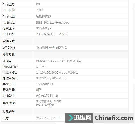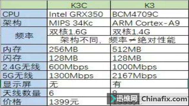 | 斐讯路由器k3和k3c有什么区别?各位老司机对这个路由器已经很不陌生,开启硬件0元购后,很多都撸了甚至不只是收到其他维修同行的一台。因为外观很漂亮,性能也很优秀! k3c的价格对比k3价格1999便宜了不少(当然最后都是返现设备都是0元)这个不多说,今天只是对比一下两个设备的一些硬件参数: k3c对比k3的主要区别: 无线速度k3c路由器1900Mbps---k3路由器3200Mbps。 主芯片k3c为Intel---k3为博通芯片。 内存与闪存k3c为256M+128M---k3为512M+128M。 主机顶部显示屏k3c无----k3无线路由器有。 天线数量k3c为6根pcb---k3无线路由器为8根。 无线天线的增益k3c为5g:6db---k3路由器5g-5db。 以下是k3路由器的参数: 以下是k3c无线路由器的参数 处理器对比: 博通BCM4709处理器支持最新的802.11ac Wi-Fi协议,采用ARM的Cortex-A9架构,双核1GHz主频。这颗处理器采用40nm制造工艺,256KB二级缓存,配备了32KB四路关联指令缓存,32KB四路关联数据缓存,以及128-entry TLB缓存。BCM4709的增强型处理器内存子系统架构提升了系统性能,大幅提升了处理能力。当然功耗会更高一点。 K3C相对K3来说,就是K3系列的“青春版”,在保留基础性能不会降低太多的情况下,降低价格,去掉一些非核心功能,并且加强了一些游戏方面的性能,可以说,如果你对K3价格还有顾虑,K2P又不能满足你,那K3C就非常好的填补了其中的空缺,稍高的性能,超强的小包转发效率,简直是游戏神器! |