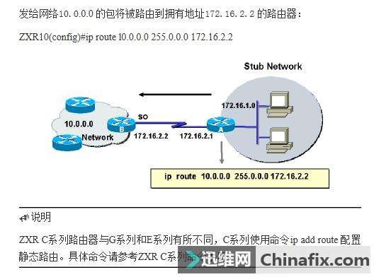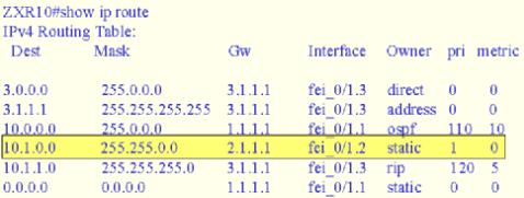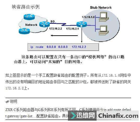 | 1.路由的分类 根据路由信息产生的方式和特点,也就是路由是如何生成的,路由可以被分为直连路由,静态路由,缺省路由和动态路由几种. (1)直连路由:路由器接口上配置的网段地址会自动出现在路由表中并与接口关联,这样的路由叫做直连路由.直连路由是由链路层发现的,其优点是自动发现,开销小;缺点是只能发现本接口所属网段. 当路由器的接口配置了网络协议地址并状态正常时,即物理连接正常,并且可以正常检测到数据链路层协议的keepalive信息时,接口上配置的网段地址自动出现在路由表中并与接口关联.其中产生方式(owner)为直连(direct),路由优先级为0,拥有最高路由优先级.其metric值为0,表示拥有最小metric值.如下图所示: 直连路由会随接口的状态变化在路由表中自动变化,当接口的物理层与数据链路层状态为正常时,此直连路由会自动出现在路由表中,当路由器检测到此接口down掉后此条路由会自动消失. (2)静态路由:系统管理员手工设置的路由称为静态(static)路由,一般是在系统安装时就根据网络的配置情况预先设定的,它不会随未来网络拓扑结构的改变而自动改变.其优点是不占用网络和系统资源,安全;缺点是当一个网络模块问题发生后,静态路由不会自动修正,必须有管理员介入,需网络管理员手工逐条配置,不能自动对网络状态变化做出相应的调整. 对于一个平滑的网络,静态路由在很多地方是必要的,仔细地设置和运用静态路由可以改进网络的性能,为重要的使用保存带宽.在一个无冗余连接网络中,静态路由可能是最佳选择,推荐以下两种情况运用静态路由: a. 在稳固是网络中运用静态路由,减少路由选择问题和路由选择数据流的过载.例如,在只有一条通路有效的stub网络中运用静态路由.某些时候,可以通过备份中心提供多条通路,这个时候,由备份中心来检测网络拓扑结构,以便当一条网络链路出现问题时,通过路由的切换来实现数据业务在不一样通路之间的切换. b. 静态路由的另一个价值方面体现在一个构筑非常大型的网络中,各个区域通过两条主链路连接.静态路由的隔离特征能够有助于减少整个网络中的路由选择协议的开销,限制路由选择发生改变和出现问题的范围. 静态路由是否出现在路由表中取决于下一跳是否可达,即此路由的下一跳地址所处网段对本路由器是否可达. 静态路由在路由表中产生方式(owner)为静态(static),路由优先级为1,其度量值为0.如下图所示: 静态路由的配置,运用ip route命令来配置静态路由,一条静态路由配置命令中要有以下几个要素: a. 目的地址:用来标识IP包的目标地址或目标网络 b. 网络掩码:和目标地址一起来标识目标网络 c. 下一跳IP地址:说明IP包所经由的下一个IP地址 d. 接口:说明IP包从哪个接口发出去 e. distance-metric:相当于路由协议的优先级,值越小,优先级越高.如下图路由器A的配置示例: (3)缺省路由:缺省路由是一个路由表条目,用来指明一些在下一跳没有明确地列于路由表中的数据单元该如何转发.对于在路由表中找不到明确路由条目的所有的数据包都将按照缺省路由指定的接口和下一跳地址进行转发. 在路由表中,缺省路由以到网络0.0.0.0(掩码为0.0.0.0)的路由形式出现.可通过命令Show ip route的输出看它是否被设置.如果报文的目的地址不能与路由表的任何入口项相匹配,那么该报文将选取缺省路由.如果没有缺省路由且报文的目的地址不在路由表中,那么该报文被丢弃的同时,将返回源一个ICMP报文指出该目的地址或网络不可达.缺省路由是否出现在路由表中取决于本地出口状态. 缺省路由在网络中是非常有用的.在一个包含上百个路由器的典型网络中,选择动态路由协议可能耗费较大量的带宽资源,运用缺省路由意味着采用适当带宽的链路来替代高带宽的链路以满足大量用户通信的需要. Internet上大约99.99%的路由器上都存在一条缺省路由,缺省路由并不一定都是手工配置的静态路由,有时也可以由动态路由协议产生.比如OSPF路由协议配置了Stub区域的路由器会动态产生一条缺省路由. 优点:运用缺省路由可以极大减少路由表条目 缺点:一旦配置不正确可能导致路由环路;可能导致非最佳路由。 (4)动态路由:路由表可以是由系统管理员固定设置好的静态路由表,也可以是配置动态路由选择协议根据网络系统的运行情况而自动调整的.根据所配置的路由选择协议提供的功能,动态路由可以自动学习和记忆网络运行情况,在需要时自动计算数据传输的最佳路由.它适应大规模的复杂的网络环境下的使用.所有的动态路由协议在TCP/IP协议栈中都属于使用层的协议.但是不一样的路由协议运用的底层协议不一样. OSPF工作在网路层,将协议报文直接封装在IP报文中,协议号89,由于IP协议本身是不可靠传输协议,所以OSPF传输的可靠性需要协议本身来保证. BGP(路由协议)工作在使用层,运用TCP作为传输协议,提升了协议的可靠性,TCP的端口号是179. RIP工作在使用层,运用UDP作为传输协议,端口号520. IS-IS协议在OSI协议栈中. 综合IS-IS工作在TCP/IP的网络层,直接封装成帧. 配置了动态路由选择协议后,动态路由协议通过交换路由信息,生成并维护转发引擎所需的路由表.当网络拓扑结构改变时动态路由协议可以自动更新路由表,并负责决定数据传输最佳路径. 动态路由协议的优点是可以自动适应网络状态的变化,自动维护路由信息而不需要网络管理员