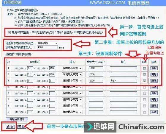 | 有一个或者多个用户在看电影或者下载东西的时候,会严重占用网络资源,导致其他用户网络资源不够,从而出现网速慢。其最佳的搞定方案就是进行路由器限速,现在很多路由器,包括无线路由器都支持限速功能,下面详细与大家介绍下怎么设置路由器限速。 路由器限速设置图文教程步骤如下: 1、首先登录路由器管理界面,一般路由器的登录地址都是192.168.1.1或者192.168.0.1,大家不妨试试,或者看路由器表面外壳上的标注即可。首先我们打开浏览器,在里边输入路由器登录地址,然后填写上用户名与密码(默认一般均为admin,如果不是请看路由器外壳上的标注介绍。 登录路由器管理界面 2、如上图,输入完路由器登录用户名与密码后,我们点击下边的确定即可进入路由器设置中心了,如果您的路由器支持限速功能,那么我们在左侧会看到有一个“IP宽带控制”,如下图: 路由器IP宽带控制功能 3、如上图,我们点击“IP宽带控制”即可进入路由器限速设了,如下图所示: 路由器限速设置界面 路由器限速设置之IP带宽控制参数说明: 1、带宽的换算关系为:1Mbps = 1000Kbps; 2、选择宽带线路类型及填写带宽大小时,请根据实际情况进行选择和填写,如不清楚,请咨询您的带宽提供商(如电信、网通等); 3、修改下面的配置项后,请点击“保存”按钮,使配置项生效。 4、如果没有设置任何状态为“启用”的IP带宽控制规则,您填写的带宽大小将不起作用。 这里路由器限速设置主要注意几个地方,首先要了解自己拉的网线是几M的,1M约等于1000K,然后就是设置IP段的宽带情况,以下笔者演示的是自己运用的是4M联通网络,想给自己的网速最低不低于2M,最高也不高于2M的条件,也就是说,在自己的网络中,给自己设置2M独享,其他用户则最低保障1M网络,最高不超过2M,具体设置如下: 路由器限速设置示例 如上图,大家设置路由器限速一定要注意以上四个步骤,首先是要第一步,要勾选上“开启IP宽带控制”,然后是第二步,选择自己家的宽带情况,上面演示的是笔者家拉的4M网络。然后就是下边的设置本地IP地址限制网络情况,上图演示的是笔者打算将自己电脑IP地址规划为192.168.1.2,网络分配情况是最低2M,最高也不超过2M,给予其他用户,192.168.1.3-192.168.1.255用户设置限制最低保障1M,最低不高于2M。 最后我们就只要将自己电脑IP地址设置为192.168.1.2即可,大家可以根据自己的情况,以及针对不一样的用户设置限速条件,主要是设置最低宽带与最高宽带资源条件;里边可以灵活设置。 |