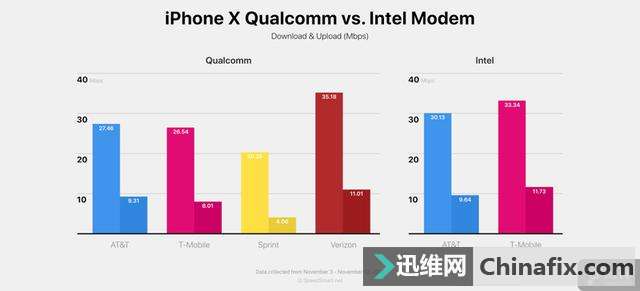 | 国外博客对采用不一样基带的iPhone X进行了网速测验,哪一种基带网速更快呢? 早在Phone7/7Plus中,苹果就配备了高通和英特尔两种基带。不仅是iPhone8/8Plus,在发售不久的iPhone X中同样存在着不一样的基带。采用哪一种基带的iPhone X网速会更快呢?为了解答这个问题,国外博客SpeedSmart.net对不一样的基带的iPhone X进行了网速的对比测验。 测验人员在11月3日至11月12日期间在美国运用LTE连接进行测验,所有的数据都来自在iPhone X上安装的SpeedSmart 苹果iOS使用程序。 下面是上图的原始数据(下载 -上传 -延时) 高通基带 ●AT&T - 27.46 Mbps - 9.32 Mbps - 38.50 ms ●T-Mobile - 26.54 Mbps - 8.01 Mbps - 50.05 ms ●Sprint - 20.28 Mbps - 4.06 Mbps - 57.76 ms ●Verizon - 35.18 Mbps - 11.01 Mbps - 53.66 ms 英特尔基带 ●AT&T - 30.13 Mbps - 9.64 Mbps - 41.84 ms ●T-Mobile - 33.34 Mbps - 11.73 Mbps - 54.23 ms 采用英特尔基带版本的iPhone X不支持CDMA网络(由Sprint与Verizon代理),所以没有测验数据。网络测验结果显示采用高通与英特尔两种基带的iPhone X网速差别不大,并不存在一种比另一种绝对的快。高通基带版本的iPhone X在Verizon网络中取得了最快的下载速度,而运用英特尔基带的iPhone X在-Mobile网络中的下载速度紧随其后。在测验数量上采用高通和英特尔基带版本的iPhone X约为 5:1,它们在AT&T和T-Mobile网络中的网速差距超过10%。 |