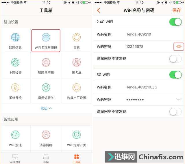 | 路由器运用的时间久了,那些关于路由器的,无线WiFi密码、管理密码,通常就会被忘记,当朋友亲戚来家里做客需要连无线WiFi时......当路由器发生各种问题,需要进入界面设置时...... 那么当我们忘记路由器的密码时,要如何维修呢? ▼ 无线WiFi密码忘记如何维修? 方式一: 1.在连接了路由器的电脑或手机中打开任意一个浏览器,在地址栏输入192.168.0.1(腾达路由器的默认管理IP地址),按Enter键,输入路由器管理密码登录界面。 wifi密码忘了如何维修 2. 登录路由器设置界面后,点击“无线设置”—“无线名称与密码”,然后就可以查看到无线WiFi密码。 wifi密码忘了如何维修 方式二: 如果你的路由器支持APP管理,你还可以直接在手机上打开“Tenda 无线WiFi”APP查看无线WiFi密码。 wifi密码忘了如何维修 方式三: 如果身边有笔记本电脑连接了路由器的无线WiFi,我们也可以在这个电脑上直接查看无线WiFi密码。 以window10系统为例,进入“网络和共享中心”—在“查看活动网络”中找到连接的无线WiFi并点击—点击“无线属性”—选择“安全”—勾选“显示字符”就可以看到无线WiFi密码咯。 wifi密码忘了如何维修 路由器登录密码忘记如何维修? 部分路由器出厂时,都有一个默认登录名称和密码,这个密码标注在路由器机身的贴纸上。 大多数品牌路由器默认的登录用户名和密码都是admin,腾达部分型号的路由器默认的登录密码为admin,而现在大多数型号(如:AC5/6/9/10/15/18、F9等等)的路由器默认没有登录密码,用户在第一次设置时可以根据提示设置登录密码。 路由器登录密码忘记如何维修 无线WiFi密码和登录密码都忘记了如何维修? 搞定办法只有一种,那就是把你的路由器恢复出厂设置(简称“复位”),按住RST(reset)的按钮或小孔10-15秒,直到路由器上所有的指示灯熄灭并重新亮起再松手即可。把路由器复位后,需重新登录路由器设置界面,然后设置相关上网参数和无线WiFi密码。 温馨提示:恢复出厂设置需谨慎,不懂设置路由器的亲请不要轻易尝试,不然怕你复位后上不了网。 wifi密码忘了如何维修专题:https://www.jdwx.cn/zt/302474-1.html |