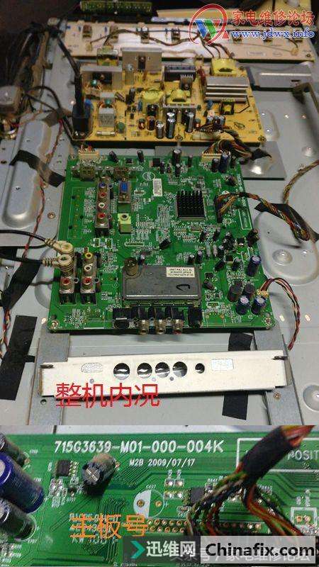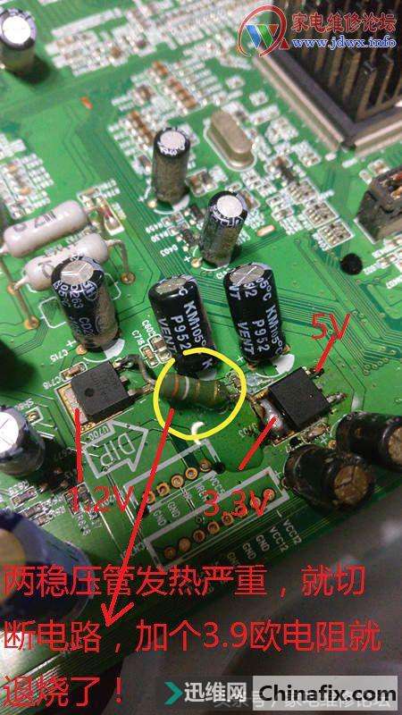 | 今天收到同行送来的故障机壹台液晶电视,开机播放几分钟就会出现打隔现象:图声时有时无,背光正常。多看久一点就弹出一种花格图片出来。从现象看,估计是主板出问题了。 拆盖检测电源板上输出的5V、12V、24V电压都正常,目标就转移到主板上来了。开机等待问题出现时,当测主板上的其中一个稳压块(1.2V)的时候,表针会随着图声打隔时,此电压会一上一下地摆动!手摸此稳压管发热严重!再理电路,前面还有一个3.3V的稳压块,手摸上去更烫手!说明问题就在此处了。 先代换此3.3V稳压管,开机后,几分钟就发烧!再加散热铝片,看了半个小时左右,问题又出现了!散热片也烫手!说明电流过大引起的。在线测量电路没有存在短路情况,代换了旁边几个滤波电容也无效!苦思瞑想之际,切断此两稳压块的连接电路,加个3.9欧的电阻上去。试机后,两稳压管全退烧了!连续试机几小时,安然无恙!电视不再打隔了。 Envision(易美逊)L32BN81液晶电视图声时有时无,背光正常维修 图 Envision(易美逊)L32BN81液晶电视图声时有时无,背光正常维修 图 Envision(易美逊)L32BN81液晶电视图声时有时无,背光正常维修 图 Envision(易美逊)L32BN81液晶电视图声时有时无,背光正常维修 图 Envision(易美逊)L32BN81液晶电视图声时有时无,背光正常维修 图 |