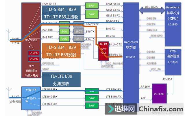 | 前几天我们谈到了3G手机的射频架构,今天讲讲更复杂的4G手机射频架构。 典型4G手机射频架构 中国移动三模8频手机射频架构 这张图是纯国产的系统和网络:联芯1860C处理器平台,搭配2G GSM,3G TD-SCDMA,4G TD-LTE。没有WCDMA、FDD-LTE频段。( 这一套是中国移动最基本的3模8频的网络,其中包含:GSM 900(B8)、1800(B3);TD-SCDMA Band34、Band39;TD-LTE Band 38.39.40.41.(只支持中移动,不支持电信和联通) TX=发射;RX=接收 TRX:这根通路上既有发射信号也有接收信号。 SRX:分集接收(在高通和MTK上都叫做DRX) SAW:SAW filter,滤波器。 SPDT:单刀双掷开关,一条输入路径,可以切换到2根输出路径上。 之所以运用单刀双掷开关,而不是双工器来隔离TX和RX,是因为TDD的3G和4G,都是“时分双工”。发射和接收都是同一频率,一会儿发射,一会儿接收。 就像人说话,先说一个字,再听一个字,再说一个字,再听一个字,如此循环,听和说就算是同时进行的了。实际上3G时代,TD-SCDMA的性能比较弱,比不上同时期的WCDMA。 强推移动上TD,纯属战略部署。中国在4G中的TD-LTE能占据更大的份额,在5G中几乎占到主导地位,都是从3G时代强推TD这个国产制式积累下来的成果。 中移动后来孤注一掷上4G,主要就是因为TD-S这个3G性能不行,不上4G就翘了。2013年之前,联通靠3G吸纳了大量的客户,移动3G速度很慢,经历过的人都会历历在目。而如今,国产4G已经和进口4G制式旗鼓相当了,所以移动继续坐着“老大哥”的地位。 4G比3G多了一根天线 高通骁龙2100平台分集接收部分原理图 对比之前的文章,可以看出来4G和3G架构最大的分别是,多了一根天线:分集接收天线。联芯的架构中叫S-Ant,Slave Antenna,但是标准叫法是“分集天线”,Diversity Antenna。4G虽然速度快,但是发射功率、接收灵敏度都比2G要差不少。分集接收天线能够增强接收性能,以及提升下载网速。 如果信号好,主天线和分集天线分别接收不一样的内容,网速就加倍了。如果信号差,主天线和分集天线接收相同的内容,信号灵敏度就加倍了。(理论提升3dB) 4G发射和接收通路 TD部分频段发射和接收流程图 2G的发射接收流程,和上一篇文章写的几乎一致,差别主要在3G和4G上。总的来讲,发射都需要有功放(PA),接收都需要有滤波器(SAW)。不一样频段之间,通过开关来切换。同一频段的发射和接收:TDD的用开关来切换,通过不一样时间来隔离发射和接收,FDD的用SAW双工器,通过不一样频率来隔离发射和接收。 |