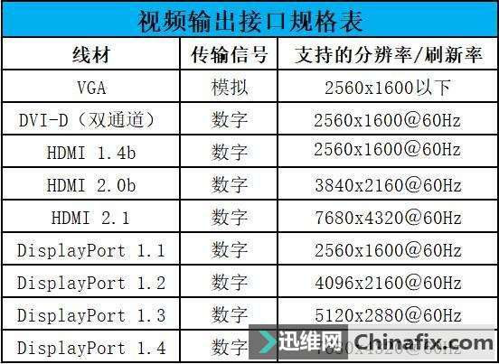 | 在我们的生活中,无论是电脑、电视还是投影设备等等,都离不开视频输出接口,尤其在显卡上面,通常会出现3种甚至更多的接口。很多人并不了解其中的分别,觉得只要有画面输出就可以了,其实对于很多显示器来说并非如此,今天就来和大家说一说视频接口那些事。 不一样视频接口有什么分别? 图 最古老的接口—VGA VGA接口(Video Graphics Array) 要说 VGA 接口的历史,最早可以追溯到1987年了,蓝色的插头也是最有辨识度的一个接口。VGA 接口有3排针脚,每排5个,共有15针。VGA接口采用的是模拟信号,在早之前运用CRT显示器(俗称的大脑袋)时,运用的都是 VGA 接口,不过现在几乎已经被淘汰了,只有个别的投影设备或是一些仪器还在运用。 VGA 接口传输的是模拟信号,抗干扰能力弱,而且现在的显示器的基本都为数字信号,模拟信号要经过多次信号间的转换,会导致部分信号遗失,造成画面质量下降,这也是它被淘汰的主要原因。 显示器运用率较高的接口——DVI DVI接口(Digital Video Interface) 随着液晶显示器的飞速发展,传统的 VGA 接口已经不能满足,DVI 接口也就此诞生,它可以实现长距离、高质量的数字信号传输,相信现在很多人的显示器都还在运用DVI接口。虽然白色的插头也很好辨别,但是具体的规格还是比较复杂的。 不一样视频接口有什么分别? 图 DVI 接口共有三种规格,分别是 DVI-I(Integrated混合),DVI-D(Digital数字)和 DVI-A(Analog模拟),其中 DVI-I 和 DVI-D 还分为“单通道”和“双通道”两种类型。 DVI-A 接口传递的仍是模拟信号,因此与 VGA 接口并没有本质的分别;DVI-I 接口同时支持模拟信号和数字信号的传输,是一个过渡性的产品;DVI-D 接口仅支持数字信号,也是现在最常见的 DVI 接口。其中,使用较多的是双通道的型号,它有着更大的带宽。DVI 接口的比较显著的缺点就是不支持传输音频信号,并且接口的体积很大,因此也慢慢地被淘汰了。 当下比较主流的接口—HDMI HDMI 接口(High Definition Multimedia Interface) HDMI 相比 DVI 接口支持了音频的输出,并且有着更高的带宽,它可以算是现在最主流的视频输出接口,由于接口变得更小,也被广泛使用于电视机、显示器、笔记本电脑等设备上。HDMI 接口虽然在规范上没有 DVI 那么负载,但是却有着不一样的形态。 不一样视频接口有什么分别? 图 其中我们最常见,运用最多的是 HDMI A Type,共有19针;HDMI B Type 可以看做是A类的双通道版,拥有29针,可传输双倍的数据量,但是它没用使用于任何的产品当中;HDMI C Type 和 HDMI D Type 在尺寸上进行缩小,更多使用于便携式产品中。 规格最强的接口—DP DP接口(DisplayPort) 在现在的显示器中几乎都标配了DP接口,它可以看做是 HDMI 接口的升级版,但是内部数据的传输方式与 DVI 和 HDMI 完全不一样,有着更高的带宽。得益于它良好的性能和先进的技术,DP 接口已经慢慢成为了高端显示器必不可少的接口。 不一样视频接口有什么分别? 图 DP 接口还有一种衍生的形式— Mini DP 接口,它是由苹果公司推出的,尺寸更小巧的 DP 接口。 Type-C 接口 不一样视频接口有什么分别? 图 USB Type-C 接口其实本身并不支持视频输出,但是它拥有替代模式,通过转接到其他芯片上来实现不一样功能,它实际运用的是DP标准的信号传输,好处是可以通过一根线搞定显示器的画面输出和供电问题。 线材的带宽很重要 不一样视频接口有什么分别? 图 在上文中,我们反复提到了一个词,那就是“带宽”。带宽对于视频输出线来说非常重要,对于一些高辨别率或是高刷新率的显示器来说,线材的带宽不够,就无法显示相应的视频效果。在上图中,以60Hz的刷新率为标准,我们列出了一些常见线材所能支持的规格。 总结 看到这,相信你已经基本能够了解不一样视频传输接口之间的分别了,在今后选择线材时一定要注意不一样线材的规格。其实最简单粗暴的方式就是,选DP就对了! |