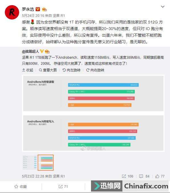 | 近日锤子科技发布了全新的旗舰机坚果R1,这部手机拥有顶级的骁龙845移动平台,而且外观依旧保持锤子的高颜值特点,这也导使坚果R1从发布之初就受到广大用户的认可。在众多版本的坚果R1中,拥有1TB储存版本的坚果R1应该是最引人注意的,因为在此之前市面上还没有搭载这么大储存的手机,那么坚果R1的性能表现非常值得期待。 有网友将1TB版的坚果R1做了跑分测验,在Androbench测验中,1TB版的坚果R1跑出了1158MB/s的读取速度和389MB/s的写入速度,而其他旗舰的成绩大多在读取速度800MB/s,写入速度200MB/s左右,坚果R1能跑出如此高的读写速度,实在惊人。 Androbench跑分数据 针对这一事件,老罗也在微博做出回应。他表示坚果R1之所以能跑出如此高的成绩,是因为锤子采用的是独家的双512G闪存芯片的搞定方案。顺序读写速度相当于双通道,大概能提升20-30%的速度,但只对IO跑分有效,实际运用中没什么差别,所以没有宣传。 罗永浩微博回应 事实上,跑分成绩的高低并不代表实际的运用体验,某一单项的跑分成绩也不能代表整机的实际性能表现。锤子科技不主动宣传产品的跑分,也算是行业里的一股清流了吧。 |
