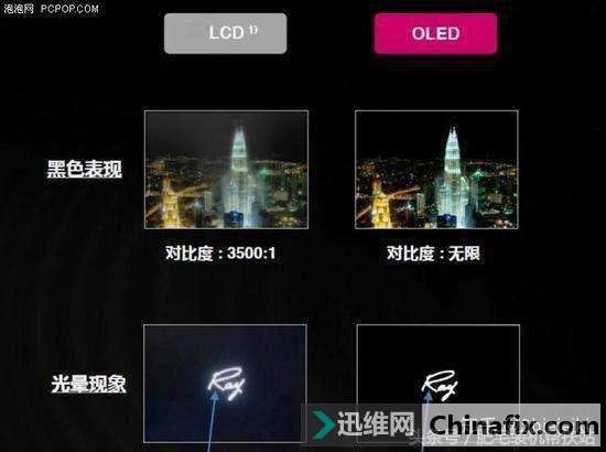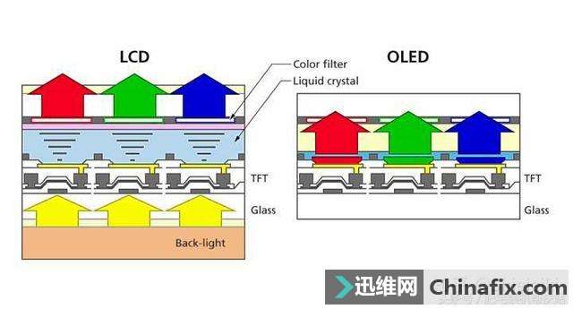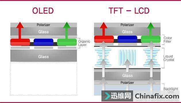 | 比较关心电子产品行业的朋友应该都清楚,随着越来越多的手机用上了OLED屏幕,LCD屏幕是越来越“不受欢迎”的,并不是说LCD屏特别差。今天小编将会用最简单的语言和图片,告诉大家OLED屏幕和LCD屏幕的区别以及它们的优劣。 要知道OLED 屏幕和LCD屏幕的分别,我们需要从运行原理上解释,所以我们先来了解一下这两者的运行原理。 【像素点的概念】 首先,你看你的屏幕是一幅完整的图画,但实际上,你贴在屏幕边上看就会发现你的屏幕实际上是由无数个小点点组成的,每个小点点各自显示自己的颜色,拼出来了一幅完整的图片,因为每个像素点比较小,所以你的眼睛会误以为这是一张完整的画面。 每一个像素点有3个子像素——红绿蓝,我们知道三原色红绿蓝是可以调制出非常多的颜色的,我们的屏幕就是通过调整红绿蓝的三原色的比例来调出成千上万种颜色的。 屏幕的成像原理各位想必应该清楚了——屏幕由无数个点组成,每个点由红绿蓝三个子像素组成,每个像素点通过调整红绿蓝子像素的颜色配比来显示颜色,最终所有的像素点拼出你看见的画面。 【LCD背光源与OLED自发光】 以下内容比较难理解,但是全篇最重要的部分,理解了这一部分你就知道了OLED和LCD的分别了。 首先这里放一张LCD和OLED的规划图,这个规划图是每个子像素的纵切截面图。 LCD的发光原理主要靠背光层,也就是上图中Back-light的部分,这部分通常由大量的LED背光灯组成,它只有一个功能,就是显示白光,但是白光不可能组成图像啊,于是我们在这个白色的背光层上加一层有颜色的薄膜,白色的背光穿透了有颜色的薄膜后就能显示出彩色了,但是我们是需要调整红绿蓝的比例啊,不能让光直接就射穿红绿蓝啊,所以我们在背光层和颜色薄膜之间加入一个控制阀门,这就是图片中liquid crystal的那一层,也就是我们所谓的液晶层,这层可以通过改变电压的大小来控制开合的程度,这样开合大的射出去的光就多,开合小的就射出去的光少,这样我们就可以控制白光的量,这样就可以调整红绿蓝的配比了。这个便是LCD屏幕的工作原理,他特别像什么,就是你拿着一个白光手电筒,前面放个可以旋转的不透明板子,前面再放个彩色塑料薄膜。 而OLED呢,OLED不需要LCD屏幕那样的背光层,也不需要控制出光量的液晶层,只要给他通电他就能亮,所以OLED就像一个有着无数个小的彩色灯泡组合的屏幕。 【LCD的致命缺陷】 LCD现在还有一个致命问题,那就是液晶层不能完全关合,所以如果LCD显示黑色的时候,会有部分光穿过颜色层,所以LCD的黑色实际上是白色和黑色混合的灰色,就像你拿一个白光手电筒射一个黑色的薄膜,穿过薄膜的光就会变成黑光吗?肯定不会,你从薄膜那一边看实际上就是亮度大幅度递减的灰色,而不是纯黑。 而OLED不一样,OLED显示黑色的时候可以直接关闭黑色区域的像素点,来达到几乎纯黑的效果。 另外由于有背光层的存在,所以LCD显示器的背光非常容易从屏幕与边框之间的缝隙漏出去,这就是常说的显示器漏光,LCD就不可能完全避免漏光现象,只能是严重程度了。 显示器的漏光现象 【OLED屏幕的优势】 厚度:LCD由于有背光层和液晶层的存在,他的厚度就要比OLED厚很多,所以OLED屏幕非常容易把手机或者显示器做薄,对于显示器没什么影响,对于手机来说就是质的飞跃,更薄的屏幕就允许你塞入更多的元器件去提升其他部分的体验。 可弯曲程度:还是因为液晶层和背光层的存在,LCD屏幕就不可能大幅度弯曲,而OLED几乎可以和折纸一样随便折,三星的曲面屏就是靠着OLED技术做支撑的。要注意的是这里说的是大幅度弯曲,台式电脑那些曲面屏幕还是LCD,你可以发现弯曲的程度都不大,OLED是可以和纸一样对折的。 色彩:对比度指的是白色比黑色的比值,对比度越高画面颜色越浓,LCD由于有背光层,黑色不是纯黑,所以对比度很难做高,OLED黑色不发光,所以可以直接关闭黑色区域部分像素点,这时候黑色几乎为0,所以理论对比度可以说是无限。这里我就一句话概括OLED色彩,OLED是油画,色彩纯而细腻,LCD是水彩笔画,色彩朦胧而且淡。我觉得普通人都是一眼就能辨别出高端OLED和LCD的分别的。 单独点亮:LCD打开就是整个背光层所有打开,所以LCD要么全开要么全关,而OLED每个像素点都是独立的,所以OLED可以单独点亮某些像素点,利用这个特点可以做到一个非常方便的功能——息屏提醒(aways on display),在屏幕关闭后,以低亮度点亮几个像素点来显示时间,点亮,以及通知,所以三星手机可以在不开启屏幕的情况下知道是什么使用来了消息,双击消息图标还能点亮屏幕。这个功能可以大幅度减少点亮屏幕的次数,间接省电了。一旦用习惯,你就会爱上这个功能。 耗电程度:OLED由于像素点独立工作,该亮的亮,该暗的暗,该灭的灭,LCD无论显示什么颜色都是背光全开,所以LCD注定耗电,下图中坚果R1和小米mix2s都是LCD屏幕,在长时间视频播放下电池续航显著吃亏。 屏幕响应时间:我们知道画面的颜色是由像素点显示来的,而像素点从颜色1变成颜色2是需要时间的,这个时间被我们称之为灰阶响应时间,如果灰阶响应时间太长,在画面快速滑动的时候像素点来不及从颜色1变成颜色2而导致出现画面残留,视觉上就会出现拖影,拖影极其影响视觉观感,OLED屏幕几乎没有任何拖延,而LCD屏幕,哪怕是苹果的顶级LCD,该拖影还是拖影。 x20和r11s都是OLED屏幕 【OLED屏幕的劣