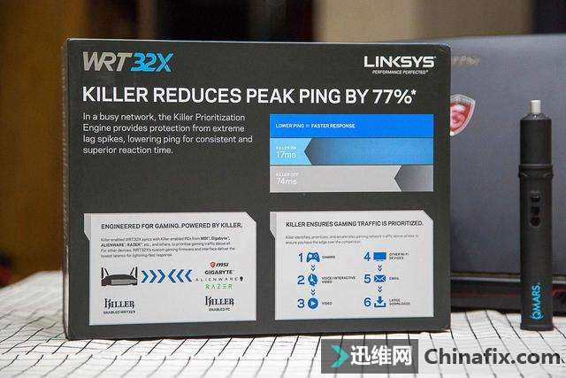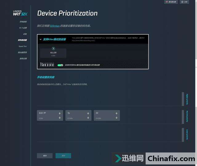 | 大吉大利,今晚吃鸡. 这句话无疑是现在流行的,这也都出自一款时下非常火的游戏《绝地求生》,最近弟弟也迷上了这款游戏,之前他的笔记本就是我选择的微星的游戏本。最近找我升级了机械键盘和游戏鼠标。家里宽带也升级到了300兆的顶配。看见我家的路由器换了一轮又一轮,就给我说想给我的GT-AC5300拿走。我心中。。。 我的路由器你还是别拿走了,我给你推荐个神器吧。既然他的微星游戏本我选的,各方面属性我肯定耳熟于心,笔记本内置killer的无线网卡,似乎领势有一块路由器专门对杀手网卡有属性加持。就给他推荐了另一款有特效的领势WRT32X。”必杀黑科技 双频游戏路由 千兆智能 KILLER引擎减少77%延迟“怎么也要体验一下这个黑科技了,早年就说杀手killer网卡是游戏神器,而且有了专门配合这个网卡有优化的路由器怎么都要试试了。 开箱晒物: 外观方面全黑的主题颜色,路由器也改成了黑色的主色。似乎就预示了这款路由器属性的不一样。正面Killer网卡属性加持非常显著。要知道现在支持Killer网卡的电脑设备已经超过1000万。 侧面是路由器的多语言版本特色介绍:双核中央处理可以高速同步;Killer network专业优化引擎;定制游戏GUI设置,控制游戏流量。 全千兆接口各部都是标配,USB3.0以及eSATA/USB2.0接口倒是很少见。 背后的介绍都是英文的,我的英语实在太菜了,只能看图说话了。对于微星、技嘉、外星人、雷蛇这些内置Killer网卡的电脑会有较好的支持。 包装上方是产品型号WRT32X。 VICTORY IS YOURS(胜利是属于你的),似乎就是那句:“今晚吃鸡,大吉大利。” 包装正面的Killer网卡支持的说明。减少延迟,更低的峰值ping time,低延迟游戏体验。 这款路由器还附送了wtfast游戏玩家虚拟网络的体验卡,可以免费试用30天。对于有国外账号的玩家会是一大福利,让你登陆国外服务器的时候获得更低的延迟,这个日常自己购买是需要9.9美刀的,只有国行的里面才附带这个哦。 开箱了,外观依旧是LinksysWRT系列的经典外观,看惯了蓝黑的配色,这款全黑的WRT32X真的看上去非常特别。 路由器下层是说明书以及四根天线。 可拆卸的天线规划,四根天线上都有领势的英文logo。 下层是产品光盘、网线、电源适配器。这次适配器体积很小,很合我心意。 所有附件,主机、四根天线、电源适配器、网线、多语言版说明书、保修卡有害物质说明、wtfast30天免费体验试用产品序列号、光盘。 12v 3A的电源适配器。 相比于老款WRT32系列,这款在外观方面并没有太多改变,正面的指示灯方面换成了蓝色LED指示灯,在形状方面也更加炫酷,可以实时监控网速与流量。 WRT32X的指示灯也很有特色,三种不一样的指示灯。看着很有电竞属性。而且只有接入设备的时候对应的指示灯才会亮起。 产品正面一般的位置都是圆形散热孔规划,可以看到内部的结构和散热片。 底部不一样于网件哪样的装饰,领势路由器底部也所有都是圆形的散热孔,方便散热。 一样可以采用壁挂式规划,四个厚实稳重的脚垫。每个脚垫高度约10mm,使机身可以离开桌面会有一定距离,从而方便路由器散热。 底部名牌规划,领势默认的无线密码显示在这个铭牌上面。无线最高标准可以达到AC3200。 接口方面前面都已经介绍了,可拆卸天线的接口、蓝色的是wifi保护设置、5个千兆lan/wan、蓝色的是USB3.0、比较特别的是后买一个eSATA/USB2.0接口、复位键、12V电源口、开关机键。 四根天线接入效果,安装效果比华硕的好很多,固定好的位置不会时长长了就倒下去。天线可以0~90度折叠。 完整形态展示。 企业级的硬件支持,在黑色的外观更有游戏属性。 设置界面: 配合杀手的网卡速度方面非常给力,第一看WRT32X的UI界面也是耳目一新。第一页可以直接测速查看网速、还支持测速之类的实用功能。 在控制面板一目了然的可以查看链接设备以及wifi网络之类的。和之前的领势界面可以说变化很大,很有游戏路由的元素,网络流量的显示很相似赛车的仪表盘。 wifi设置方面出了基础的名称密码意外,WRT32X最大的特色是默认开启“BAND STEERING 频段引导技术”,使得2.4G 与5G SSID 合并成一个,由系统算法在不一样的频段间自动切换运用,实现家里信号更好的覆盖。不过我还是习惯把两个信号分开。在分开SSID的时候5G可以设置支持160的通道,这应该是现在唯一支持160通道的路由器设备。 设备管理,可以自定义接入设备名称,还可以自动识别是否是杀手killer网卡。 优先级设备,自动识别杀手网卡,另外也可以手动调整优先等级,这里也可以选择非杀手网卡设备等级更加优先。 速度测验方面,可以测验家里的网速。现在这个技术在主流路由器上似乎都有,在网络有问题的时候可以直接检测网络。 路由器的基础设置功能,常用规划都在这里显示。路由器内置了各种不一样的语言版本,方便不一样需要的用户,这点比网件那个靠谱多了。这里也可以设置led指示灯的显示情况。 高级设置功能,端口转发: 静态IP保留 「科学上网」客户端 外部储存,这款WRT32X提供了USB3.0和esata和USB2.0接口。可以做成简单的云储存功能,可以提供SMB、FTP、DLNA支持等。方便提供一些简单NAS的功能。 DDNS设置: 本地网络设置,路由器IP设置可以在这里调整。 网络链接设置,常见的设置模式都有。 运用感受 : 由于弟弟的笔记本是支持killer网卡的,领势的网页设置界面有了非常大的变化,黑色的