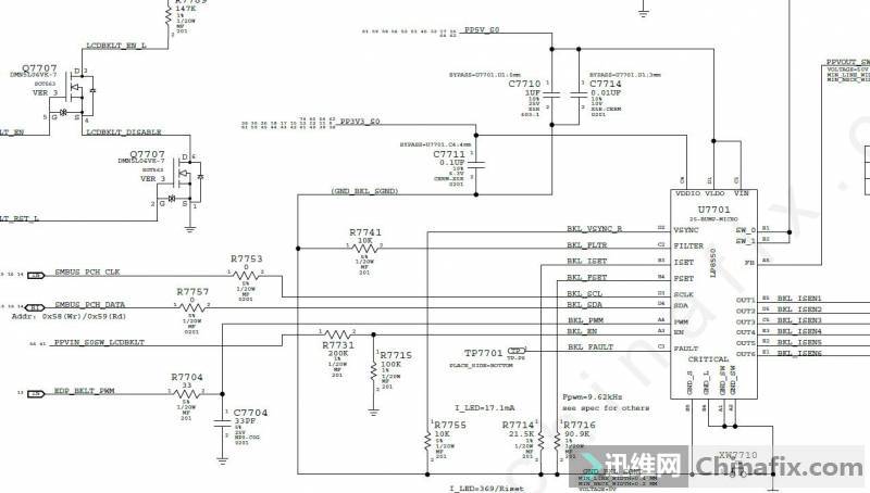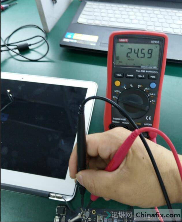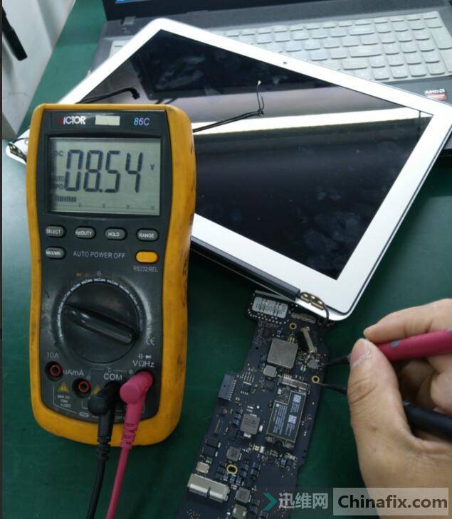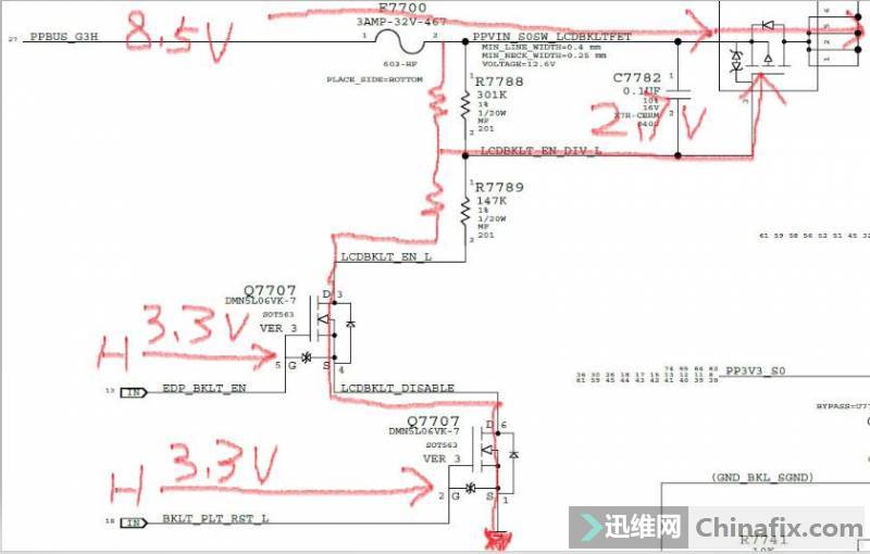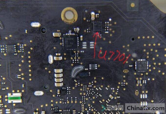 | 收到同行送来的故障机壹台苹果 A1466机器,板号:820-00165-A,客户说此机器是以前进水维修过的机器,主板上进水面积挺大的,修好后用了一段时间,昨天晚上正在工作中,忽然屏幕一闪而过,笔记本屏幕暗屏了,再怎么开也是暗屏,用手电筒可以看到里面显示的画面。 拆机检测,主板上没有烧坏的痕迹,脑海中的目标指向背光控制芯片U7701,实测芯片 PP5V_S0 电压 在C7714上测量为5V正常,PP3V3_S0 电压测量为3.3V正常PPVIN_S0SW_LCDBKLT 背光开启信号为2.8V正常。 苹果A1466笔记本开机暗屏检修思路 图1 这一路检查完,再来检查背光升压电路这一块,如下图,检测后均为正常。 苹果A1466笔记本开机暗屏检修思路 图2 PPBUS_G3H 电压为8.5V 苹果A1466笔记本开机暗屏检修思路 图3 检测 正常,再测后面的升压之后的电压为19.8V,明显电压偏低,升压成功后正常应为24V左右,背光亮起。 苹果A1466笔记本开机暗屏检修思路 图4 外围电路都排除完了,问题指向背光芯片 U7701。 苹果A1466笔记本开机暗屏检修思路 图5 拆下来,换掉。 苹果A1466笔记本开机暗屏检修思路 图6 换上新的后,电压恢复正常为 24.5V ,屏幕正常亮起。 苹果A1466笔记本开机暗屏检修思路 图7 接上硬盘,进系统亮机正常,至此,苹果A1466笔记本开机暗屏检修思路完成。 苹果A1466笔记本开机暗屏检修思路 图8 |