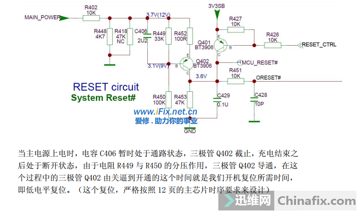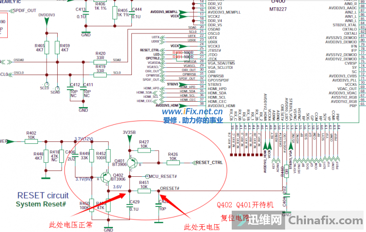 | 收到同行送来的故障机壹台TCL C32E330B,描述的是故障液晶电视不开机,电源指示灯不亮,三无状态。此机属于MT27C机芯,拆机电源保险未断,无短路地方。通电开机测量电源板和主板连接处电压。 TCL C32E330B液晶电视不开机维修 图1 上面两个控制背光的端子肯定不正常,问题一定出在主板上。测量主板各LDO输出均正常,另外根据此机遥控器和按键均不起作用来看MT8277里CPU工作条件估计是不具备的,还有程序数据。这样的芯片连接809F读写虽然慢如蜗牛,但经一试根本连接不了,因此判断要么CPU要么程序坏。拆掉25Q32离线读取正常,写入新的数据焊回开机故障如初。测量晶振两端1V、1.24V有压差正常,测量复位端MT8227的51脚问题来了,没电压! TCL C32E330B液晶电视不开机维修 图2 Q402、Q401组成开待机复位电路,经R451至芯片51脚,测R451左端3.6V,而右端无电压。测R451、C428正常,在路测51脚对地电阻正反220欧,果断吹下8227再测51脚220欧没变,MT8227隔日换新后修复。 维修手册里对复位电路的说明如下: TCL C32E330B液晶电视不开机维修 图3 809F读取TCL C32E330B屏LVW320CSTM C3 V1.zip |
