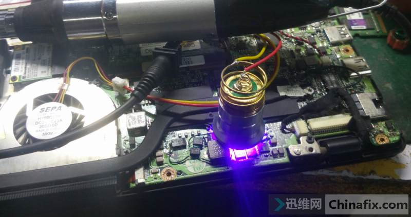 | 收到同行送来的故障机壹台神舟UI47超级笔记本,故障是触发0.12A左右掉电,能重复触发,笔记本电脑无法开机,笔记本电脑无法开机如何维修?接下来跟随小编一起来看看维修师傅是如何修复的吧。 机器相关图片如下: 神舟飞天UI47笔记本电脑无法开机如何维修 图1 神舟飞天UI47笔记本电脑无法开机如何维修 图2 神舟飞天UI47笔记本电脑无法开机如何维修 图3 维修过程:上电0.12掉电猜测应为部分电压没有起来,上示波器,示波器测得其他电压都有,就桥附近一个电感、CPU供电、集显供电没有,那就先看看桥附近电感供电波形吧。 电感后端没抓到波形,电感前端波形如下: 神舟飞天UI47笔记本电脑无法开机如何维修 图4 上管G级波形如下: 神舟飞天UI47笔记本电脑无法开机如何维修 图5 波形明显有问题,可以看到上管G级是有自举起来的,但是持续时间太短,这就导致电路不能持续稳定输出,最终电压起不来,这种情况一般有两种,管子不良和芯片不良;管子是异型复合管,脚位很扯淡,改电路之前没拍这是改完的。 神舟飞天UI47笔记本电脑无法开机如何维修 图6 芯片也相当的稀有: 神舟飞天UI47笔记本电脑无法开机如何维修 图7 管子和芯片都是稀有的,再加上我猜测也是管子问题多一些,这种管子肯定没有,那就来个移花接木吧!找了个空地改电路,这是初模型。 神舟飞天UI47笔记本电脑无法开机如何维修 图8 这是已经输出的完美电压: 神舟飞天UI47笔记本电脑无法开机如何维修 图9 亮机后用紫光灯固化绝缘裸露在外面的接线点,然后再MOS管底下涂上硅脂,最后用热熔胶将MOS管紧紧粘在主板上。 神舟飞天UI47笔记本电脑无法开机如何维修 图10 神舟飞天UI47笔记本电脑无法开机如何维修 图11 至此,神舟飞天UI47笔记本电脑无法开机,移花接木秒杀触发0.12A掉电故障修复。附上亮机图: 神舟飞天UI47笔记本电脑无法开机如何维修 图12 笔记本掉电专题:https://www.jdwx.cn/zt/29073-1.html |