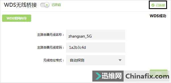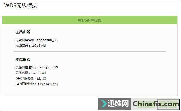 | 无线桥接这个功能,是一个比较实用的功能,在面积较大的环境(如别墅、写字间等),路由器无线覆盖范围有限,部分区域信号较弱到或存在信号盲点。无线WDS桥接功能可以扩展无线覆盖范围,实现信号增强、移动漫游的需要。主路由器与副路由器通过无线WDS桥接,无线终端可连接副路由器上网,移动过程中自动切换,实现漫游。那么两个路由器无线桥接怎么设置呢?接下来请跟小编一起通过文章了解一下。 不一样的无线路由器,无线桥接的设置方式会有一些不一样,但是本质上都是相同的。本文以两个最新版的路由器为例,教大家来演示无线桥接设置方式。 步骤/方式: 1:第一步先确定主路由器无线参数 2:操作电脑连接到副路由器的LAN口或无线信号(默认为TP-LINK_XXXX),打开浏览器,清空地址栏并输入tplogin.cn或192.168.1.1,设置不少于6位数的登录密码, 点击登录,如下图: 3:进入管理界面后,点击 高级设置 > 无线设置5G > WDS无线桥接,点击WDS无线桥接中的 下一步,开始设置,如下图: 注意:如果运用2.4G桥接前端主路由器,请点击 无线设置2.4G > WDS无线桥接。 4:路由器会自动扫描周边信号,找到主路由器的信号,点击 选择,路由器自动提示输入主路由器的无线密码,请正确输入,并点击 下一步。如下图: 5:设置副路由器无线网络名称和无线密码,并点击 下一步,如下图: 6:将副路由器的LAN口IP地址修改为与主路由器在同一网段且不冲突,并点击 下一步,如下图。 7:确认配置信息正确,点击 完成,设置完成。如下图: 8:确认WDS成功 观察右上角WDS状态,已连接 表示WDS桥接成功。如下图: 9:点击 网络参数 > DHCP服务器,关闭DHCP服务器 10:无线桥接设置完成。 搜索 复制 以上就是小编为大家带来的两个路由器无线桥接怎么设置的方法,有需求的朋友不坊可以按照步骤试一试! 收藏 |