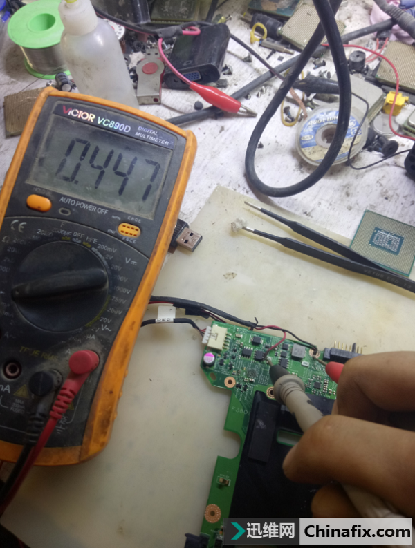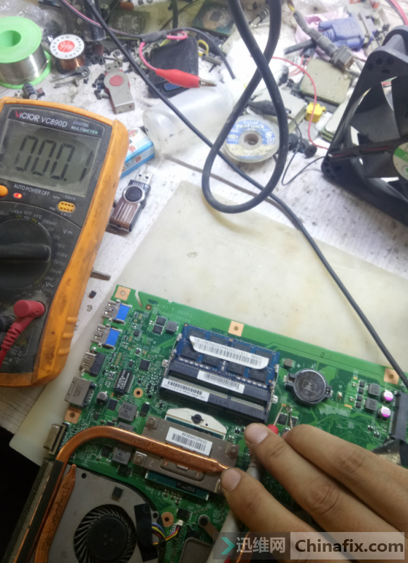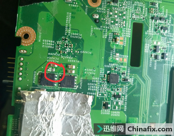 | 今天接收收到其他维修同行的一台联想B590笔记本,故障表现为是插电大短路,连续插两次连电流都没有了,一起来看看吧! 拆开测量发现公共点短路。 联想B590笔记本插电大短路 图1 PU3801击穿了,F3801保险也烧断了,找了个P管和保险换上,接着去烧公共点,烧了半天没有一点温度,仔细观察一下,发现问题。 联想B590笔记本插电大短路 图2 这个地方烧焦了,把电容拆掉,测量还短路。继续看看有没有啥异样,看了半天也没发现哪里不一样,没办法用万用表量量MOS管看看哪里有没有短路的,量到CPU供电发现mos管DS为0,以为是mos管短路,全部拆掉还短,把CPU供电芯片拆掉还短,说明这里不坏,装上继续测,当我测到电池接口旁边的模式管时,发现也为0,但是拆掉又不坏,看旁边的电容不顺眼,量量也为0,拆掉试下。 联想B590笔记本插电大短路 图3 拆掉后再测不短路了,卧槽坏的真隐蔽啊。 联想B590笔记本插电大短路 图4 公共点对地值447正常了。 联想B590笔记本插电大短路 图5 总共坏了这么多。 联想B590笔记本插电大短路 图6 接上屏幕亮了,笔记本插电大短路维修到此结束。 |