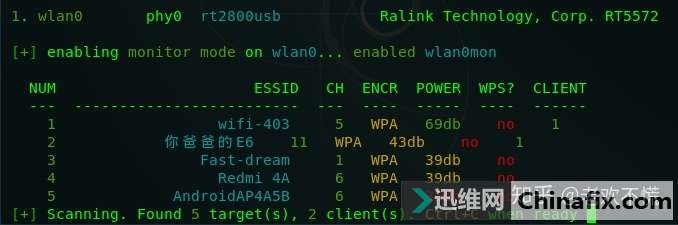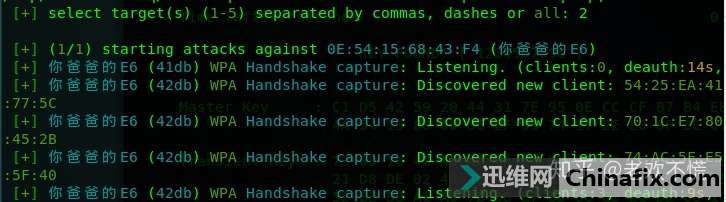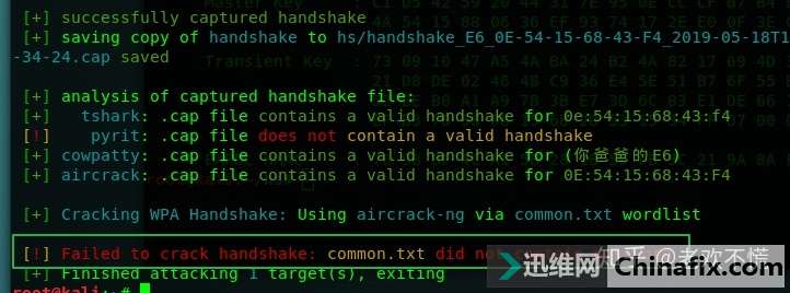 | 可以仕则仕,可以止则止,可以久则久,可以速则速 ——孟子准备环境:kali linux外置网卡 1.首先,打开kali linux,插入外置网卡,在终端输入 iwconfig 查看外置网卡名字。 2.开启网卡: ifconfig up wlan0 3.启动wifite:打开终端输入wifite 由上图所知,当前有5个wifi。 其中,ESSID是wifi名称,CLIENT是当前wifi连接了几个设备 第一个热点wifi-403和第二个热点 你爸爸的E6各连接了一个设备 由于我们破解wifi密码需要抓到握手包,所以只能选择有设备连接着的wifi热点,至于无设备连接的热点是无法抓到握手包的 wifi-403是我舍友的wifi热点,被我搞过一次,被骂的很惨,不敢再搞了。 而 你爸爸的E6 可能是隔壁宿舍的,没见过这么狂的ID,不搞你搞谁。 4.按住ctrl+c停止搜索附件wifi,然后我们选择wifi热点编号为 2的热点(你爸爸的E6),开始抓取握手包。 由上图绿色方框所知,握手包抓取成功,但自带的字典里面没有正确的密码,那我们就用自己的字典爆破握手包。 在root目录下会生成一个hs文件夹,握手包就在这个文件夹里面 抓取到的握手包 5.在终端输入aireplay-ng -w /root/文本/password.txt handshake_E6_DE-54-18-6843-F4_2019-05-18T13-34-24.cap开始爆破握手包。 其中 -w参数指定字典文件,password.txt是我的字典 handshake_E6_DE-54-18-6843-F4_2019-05-18T13-34-24.cap 是握手包文件 如图红色方框内 1234567890就是wifi密码 到此为止,密码破解成功。 想要字典文件请到以下链接下载wifi密码破解 - 403工作室 laohuan.art |