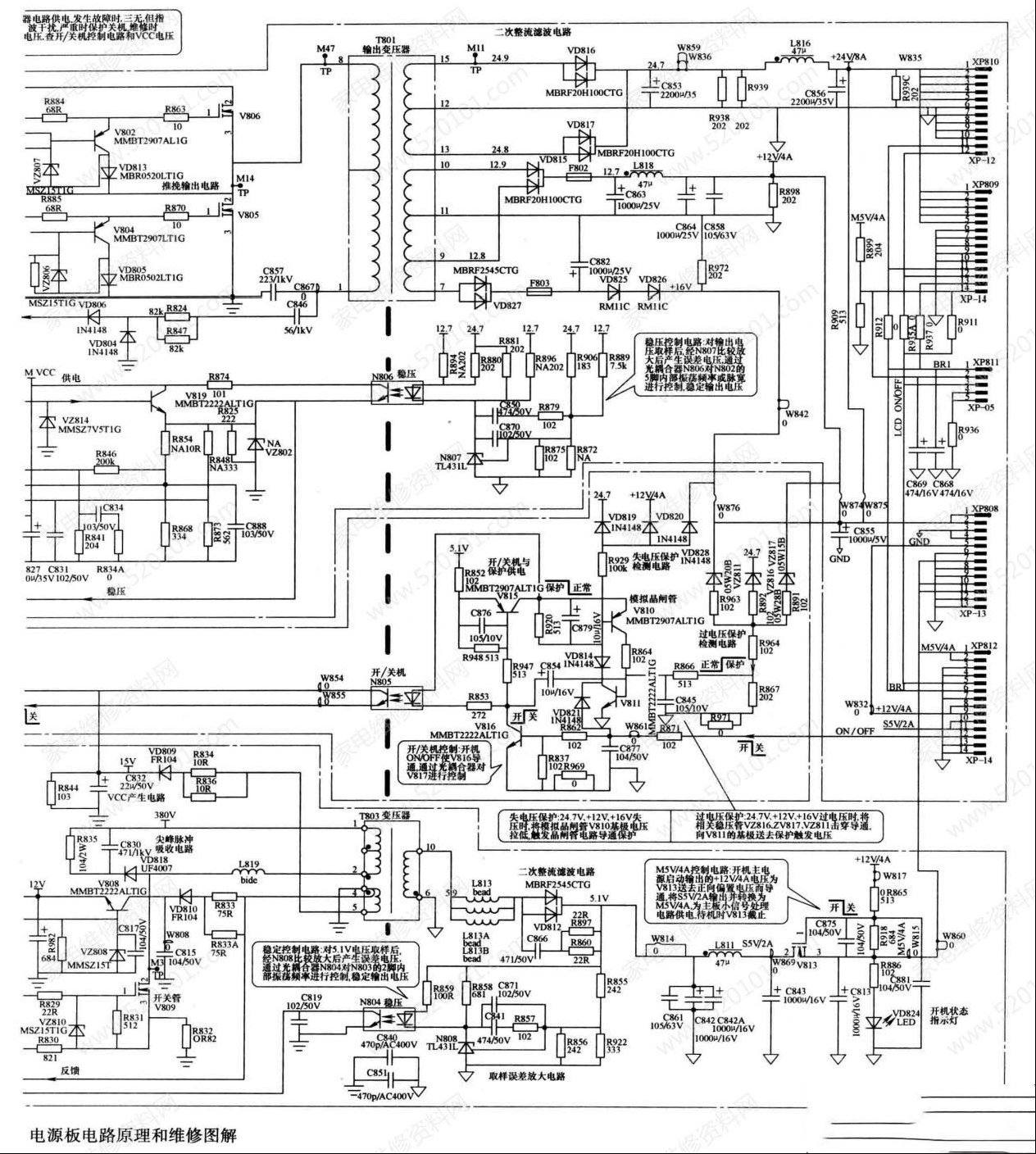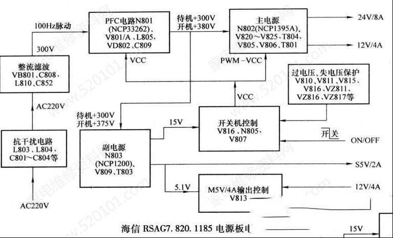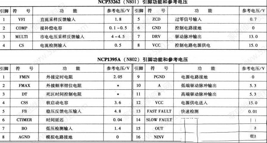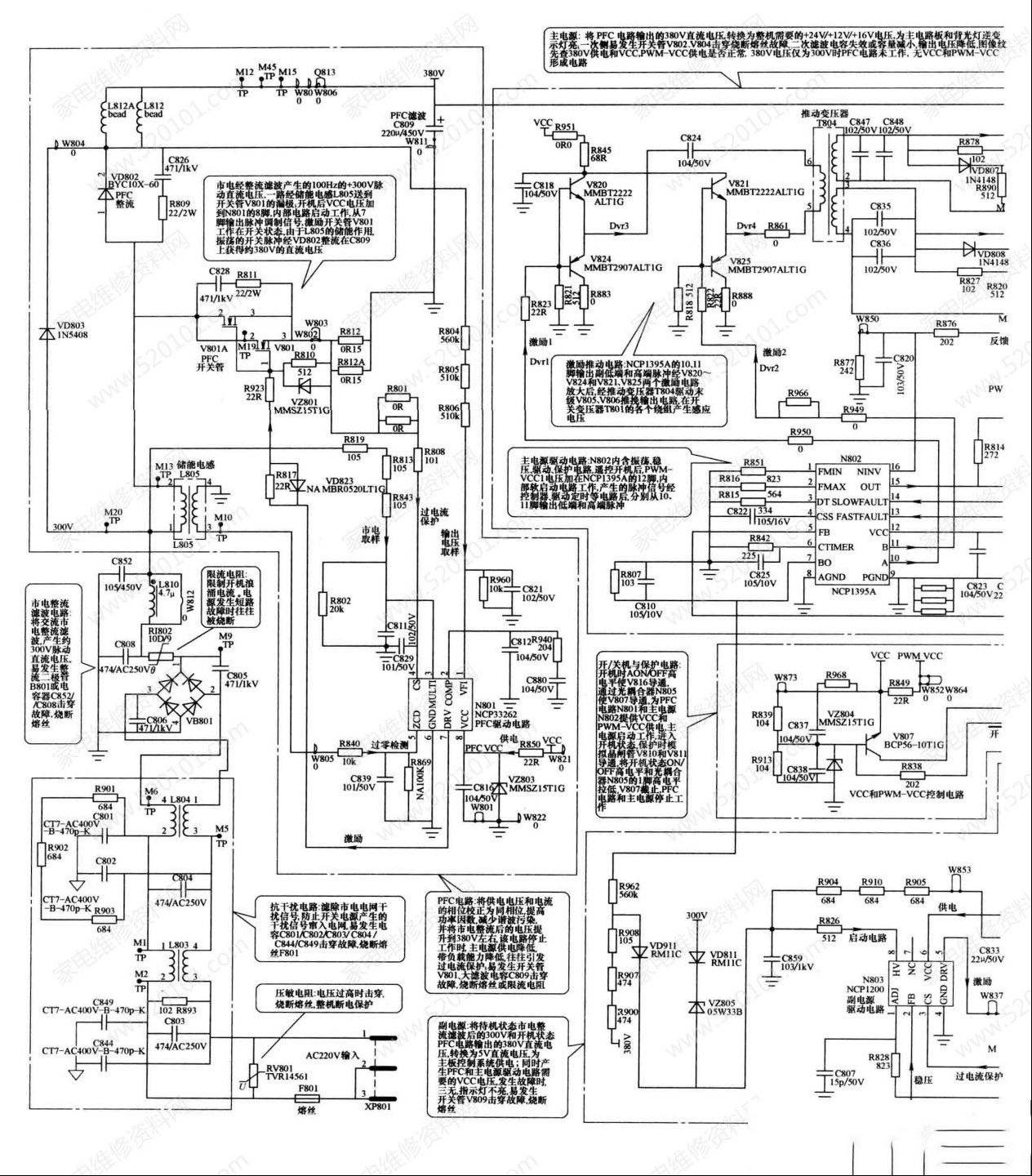| 海信液晶彩电采用的RSAG7.820.1185电源板,应用于海信TLM4039CP、TLM40V69P 、TLM42V68P、TLM42V88GP、TLM42P69GP、TLM42E58P等液晶彩电中。海信RSAG7.820.1185电源板实物图解如图1所示;电路组成框图如图2所示。该电源板集成电路采用NCP33262 (N801) + NCP1200 (N803) + NCP1395A (N802) 组合方案。 该电源板由三部分组成: 一是以集成电路NCP33262 (N801)为核心组成的PFC电路,将整流滤波后的市电校正后提升到380V为主开关电源供电;二是以集成电路NCP1200 ( N803)为核心组成的副开关电源,产生+5V电压,为主板控制系统供电,同时产生PFC电路和主电源驱动电路需要的vCC电压;三是以集成电路NCP1395A ( N802)为核心组成的主开关电源,产生+24V/8A、+12V/4A、 +16V 电压,为主板和逆变器板供电。 待机采用控制PFC电路N801驱动电路vCC和主开关电源N802驱动电路PWM-VCC供电的方式。接通市电电源后副电源首先工作,产生vCC和+5V电压,其中+5V电压为控制系统提供电源,二次开机后待机控制电路将VCC和PWM-VCC电压送到N801、N802, PFC 电路和主电源启动工作,为整机提供+24V/8A、+12V/4A、 +16V 电压,进入开机状态。该开关电源还设有以模拟晶闸管V810、V811 为核心组成的过电压检测和失电压检测保护电路,保护电路启动时,将开关机控制电路ON/OFF高电平拉低,进入待机保护状态。 该电源板的集成电路引脚功能和参考电压见表1 ~表3。 1.指示灯不亮 故障在副电源电路。先测量熔丝F1是否熔断,如果已经熔断,说明开关电源存在严重短路故障,注意检查抗千扰电路和市电整流滤波电路电容、二极管是否击穿,PFC电路和主、副电源MOS开关管是否击穿。再查300V或380V供电是否正常,N803 的8脚启动电压是否正常。上述工作条件正常,再查N803及其外部电路元器件,如果V809击穿,注意检测尖峰脉冲吸收电路是否开路失效,避免二次击穿V809。如果发生开机的瞬间指示灯亮,遥控开机后指示灯熄灭,则是过电压保护电路启动。 2.指示灯亮 主电源始终无电压输出,故障是主电源未工作。测量NCP1395A的12脚有无PWM-VCC供电,无PWM-VCC供电,检查开关机控制电路;有PWM-VCC供电,则测NCP1395A的10、11 脚有无PWM驱动脉冲。无PWM驱动脉冲,重点检查NCPI395A的外围元器件和各脚电压、电阻;有PWM驱动脉冲,查激励推动电路和推挽输出电路。 3. PFC电路故障 如果测PFC电路输出的电压为300V,则是PFC电路未工作,重点检查PFC电路。首先测量N801的8脚有无VCC供电,如果VCC电压正常,则检测N801的7脚有无PFC驱动脉冲输出。如果无PFC驱动脉冲输出,查N801的外围元器件;如果有PFC驱动脉冲输出,则检查7脚外部的V801。4.自动关机如果测主电源开机的瞬间有24V、12V、16V 电压输出,然后自动关机,测量保护电路V811的基极.电压变为高电平0.7V以上,则是以模拟晶闸管为核心的过电压保护电路启动。可采取解除保护的方法进行维修。全部解除保护:将V811的基极对地短路。逐路解除保护:对于过电压保护电路,逐个断开VZ811、VZ816、 VZ817; 对于失电压保护电路,逐个断开VD819、VD820、 VD828 。 海信RSAG7. 820. 1185电源板电路原理和维修图解如图3所示。 |