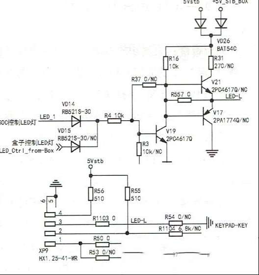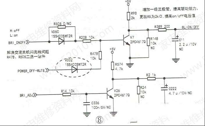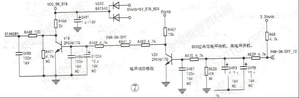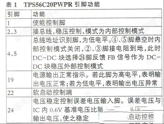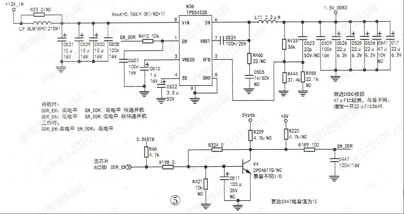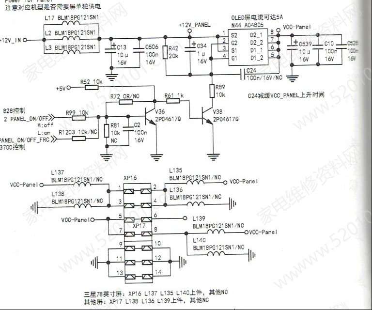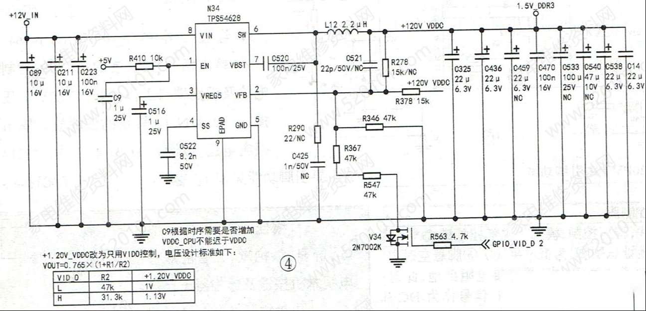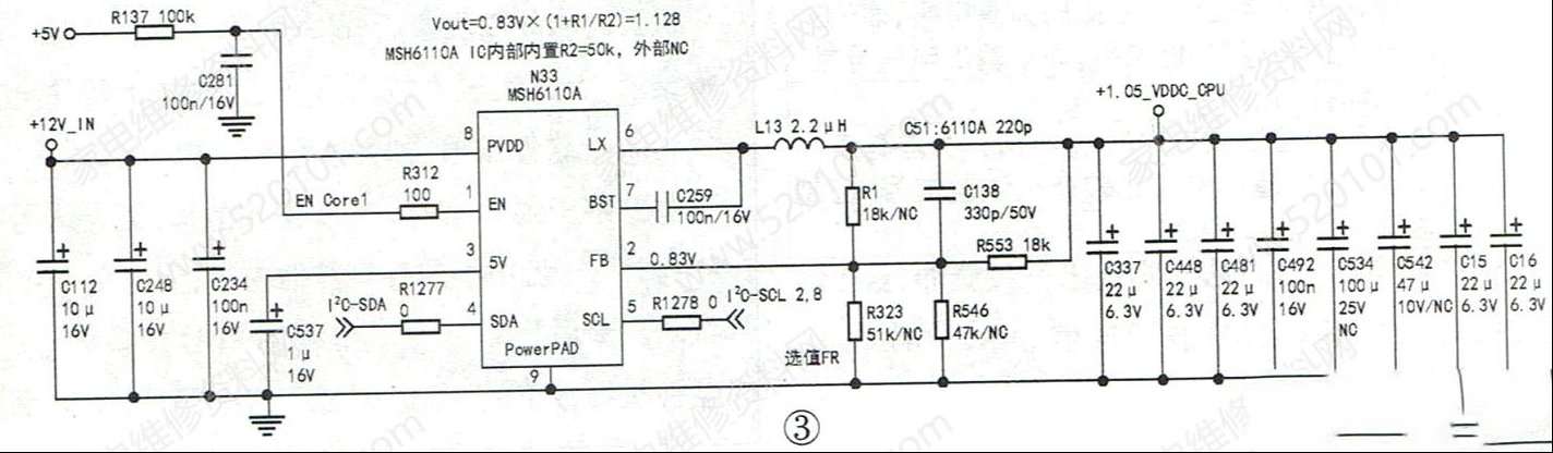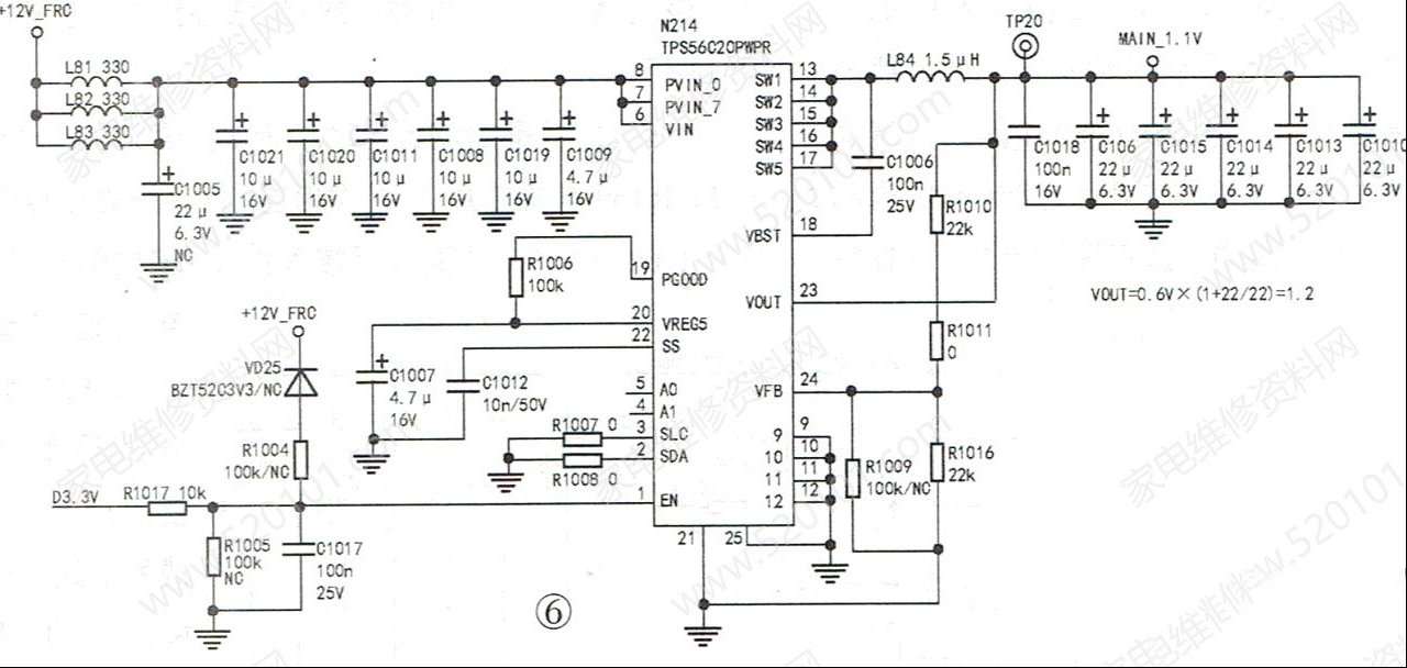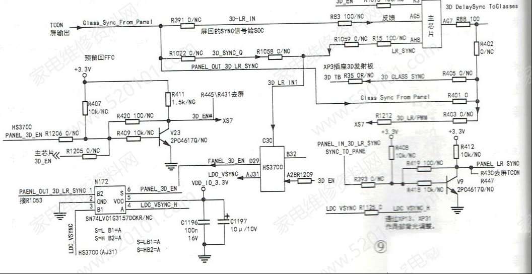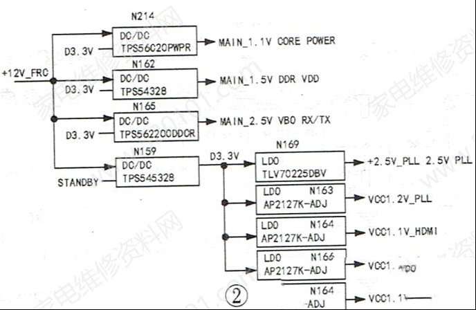 | MU7000U系列液晶电视产品是海信公司2016年推出的,主要机型有LED43M7000U、LED50MU7000U、LED55MU7000U、LED65MU7000U、LED7OMU7000U等。产品的主芯片为MSD6A828EV(N1),外接四块DDR3存储器(型号为H5TQ4G63CFR-RDC,位号N60~N63),一块EMMC存储器( KLM4G1FE3A-A001,位号N56),并安装有画质处理芯片HS3700,且外挂两块DDR3存储器( N176.N177,H5TQ4G63AFR-RDC)。主板电路板编号为RSAG7.820.6772。 一、主板供电系统 该系列产品主板供电分布如图1所示。12V电压经L87、L90、L93后去超画质处理电路供电分布,如图2所示。下面对关键的DC-DC转换电路进行介绍。 1、 +1.05V-VDDC-CPU内核电压形成电路 该电路以N33( SMH6110A )为核心构成,如图3所示。1.05V电压是系统内核工作的重要电压。N42工作后输出5V电压经R137、R312接入N33的①脚(EN)。N33还受④、⑤脚总线控制。此总线与EEPROM存储器N50、功放NTP8204的总线属同.路。此总线经IC内译码器转换后,控制N33内部调整输出端电压,本电路中②脚仅通过R553接在输出1.05V电压上,不安装取样电阻R1 R323、R546。 2. +1.2V-VDDC内核电压形成电路 该电路以N34(TPS54628)为核心构成,如图4所示。 本电路输出的+1.20V_ VDDC也是内核的关键电压,但它较N33输出的内核电压+1.5V-VD-DC_ CPU电压要滞后一点。此IC的FB脚除外接取样电阻R378.R346外,还受主芯片GPIO_VID_0信号控制,主芯片根据内核运行状态调整N34输出电压的大小。当此路控制信号为低电平时,V34截止,N34输出1V电压;当此路控制信号变为高电平时,V34饱和导通,电阻R367、R547接入FB电路,N34输出1.13V电压。 3. +1.5V- DDR电压形成电路 该电路以N36( TPS54328 )为核心组成,电路如图5所示。 ①脚(EN)是DDR启动控制端,通过R1980、R324.R189与主芯片AG2脚相连。若系统处于慢速启动DDR时,EN为高电平接入由V4组成的电路;若快速启动DDR,EN为低电平而不使用由V4组成的电路。当N36的①脚电压大于1.6V 时,IC的③脚内的5V基准电压形成电路工作,产生5V电压供内部电路工作,从⑥脚输出开关脉冲,经L11及C526、C525等电容滤波后产生+1.5V DDR3电压供N60~N63工作。 MAIN-1.1V电压形成电该供电电路以N214(TPS56C20PWPR)为核心构成,如图6所示,输出电压供给画质处理芯片HS3700。在N214启动前,N159输出D3.3V电压,同时3.3V经图2中的N169、N163、N164、N166输出相应电压,使HS3700的控制电路及识别端口工作,这时D3.3V电压接入N214.N162等块的使能端,输出相应电压,以满足HS3700工作。N214的主要引脚功能见表1。 二、控制电路 1.开/待机控制 主芯片AG6脚输出PWR-ON/OFF IC信号经R529、R470送给V24基极,如图7所示。开机时,PWR-ON/OFF-IC信号为高电平,V24饱和导通,V18因基极为低电平而截止,V18的c极输出高电平STANDBY信号,经XS7的17脚去电源板,以启动PFC及主开关电源电路。待机时停止工作。待机时,V18饱和导通,XS7的17脚为低电平。另外,V18的c极输出的STANDBY信号还送给N159的①脚(EN),以便开机时输出D3.3V电压供HS3700工作,其电压分析见图2。同时,V18的c极输出STANDBY信号经R178去V40基极,开机时STANDBY为高电平,V40饱和导通,N42(AO4459 )导通工作,5VS电压通过N42形成+5V电压供图像、伴音电路工作,其电压分布见图1。待机时,无+5V电压输出,图像、伴音小信号处理电路及DDR、EMMC、EEPROM存储器电路停止工作,实现待机低功耗。 2.背光亮度与背光开/关控制 XS7的⑦脚为背光亮度信号BL-ADJUST,接V26的c极。主芯片AJ8脚输出BRI ADJ信号,经R14接入V26基极,如图8所示。V26的c极电压越低,背光越暗,反之背光越亮。主芯片AJ12脚输出背光开/关信号BRI ONOFF,经VD50、R208接入V7基极,V7的c极输出BL-ON/OFF信号去XS7的⑧脚。需要说明的是,插座XS7的西脚(3D_ .GLASS/NX PWM)为能效混合调光端,当整机启动3D功能时,由主芯片T11脚输出NX_ ADJ数字PWM信号,经V8放大以及R549、C11平滑滤波后变成变化的直流电压,通过xS7接入背光电路,校正背光亮度。XS7的⑧脚(3D_ EN# )为3D开/关控制端,用于调整电视机工作在2D或3D状态时背光电流. 3.3D控制电路 该系列彩电的3D控制电路如图9所示。由于不同机型采用的3D方案不完全相同,故实际电路也有所差异。下面对这几种方案分别进行介绍。 第一种:当用户启动3D功能时,主芯片K3脚输出3D EN信号,经R1075后一路经R1209去HS3700的A28脚(未使用HS3700时,不装R1209),启动3D画质处理。第二路经R1205去V23电平转换后,从c极输出3D EN#信号,一路经插座 xs7的13脚去背光电路,另一路经R445.R431及上屏线去液晶屏,让液晶屏工作在3D状态。液晶屏工作后,反馈回3D同步眼镜开/关信号Ghas Syne. From Panel,经R391返回主芯片AG5脚,再从AG7脚输出已延时校正后的3D同步信号3D DelaySync ToGlass,经R402后分两路:一路经R403.XS7去控制背光亮度,另一路经R405.R35去插座XP3所接的3D眼镜发射板。 第二种:主芯片输出3D使能信号去液晶屏(与第一种方案控制相同),屏反馈回主板的Glas. Symc. From_Panel信号通过R401后,一路通过R405接入3D发射板,另一路通过R403去背光电路。该电路3D方案时未安装R391、R402等元件。 第三种:主芯片输出3D使能信号去HS3700(A28脚,HS3700工作在3D状态下。同时,主芯片AH8脚输出LR SYNC同步信号通过R1059去HS3700(C30)脚,经HS3700同步处理后,从B32脚输出的信号经V9放大后,从V9的c极输出PANELLRsYnC信号,通过R430、R447送给液晶屏组件。经液晶屏再次处理后的3D同步信号Glass_ Sync From Panel又返回到主板,一路经R391反馈回主芯片AG5脚,校正主芯片AH8脚输往HS3700( C30 )脚同步信号的相位另一路经R401后分成两路,一路通过R405接入3D发射板,另一路通过R403去背光