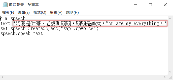 | 相信很多使用过Win10系统的小伙伴都不清楚其实我们所见到的开机问候语是能够进行更改的吧,那么我们应该如何去更改呢?其实操作起来非常的简单,下面就跟着小编一起来看看吧,有需要的用户可不要错过。 Win10如何自定义开机欢迎语的方法 首先要建立个包含语音消息的 VBScript,然后把它放入启动文件夹让 Windows 启动时执行,先开启你的记事本,可以使用屏幕右下角的放大镜输入搜索。 然后复制贴上以下代码: dim speech text="Your Message" set speech=CreateObject("sapi.spvoice") speech.speak text 你可以用你想说的话替换「Your Message」这段,记得外面要加引号,我先不换试试。 按保存,随便输入一个档名但副档名一定要是「.vbs」,于是我就输入「欢迎声音.vbs」。 我将文件存在桌面,点两下或是右键开启就会播放声音,刚刚设定的是「Your Message」,可以点编辑更改。 当然要来点不一样的,换个包含中、英文、标点符号的好了,除了问号和惊叹号大部分标点都支持,完成后存档。 接着我们要将这个文件放进「Startup」资料夹,使用快速键 Win+R 叫出执行视窗,输入「shell:startup」后确定。 将刚刚制作的文件放进启动资料夹,再关闭即可,之后当你开机进入桌面就会播放这段声音了,蛮好玩的。 以上就是win10自定义开机问候语的方法了,赶紧试试吧。 |